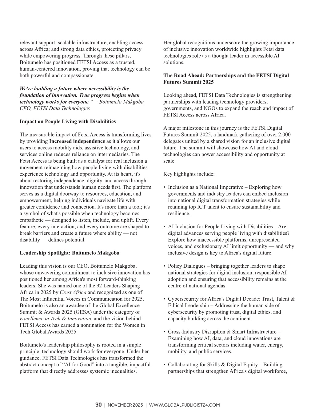 relevant support; scalable infrastructure, enabling access across Africa; and strong data ethics, protecting privacy while empowering progress. Through these pillars, Boitumelo has positioned FETSI Access as a trusted, human-centered innovation, proving that technology can be both powerful and compassionate. Her global recognitions underscore the growing importance of inclusive innovation worldwide highlights Fetsi data technologies role as a thought leader in accessible AI solutions. The Road Ahead: Partnerships and the FETSI Digital Futures Summit 2025 We're building a future where accessibility is the foundation of innovation. True progress begins when technology works for everyone.”— Boitumelo Makgoba, CEO, FETSI Data Technologies Looking ahead, FETSI Data Technologies is strengthening partnerships with leading technology providers, governments, and NGOs to expand the reach and impact of FETSI Access across Africa. Impact on People Living with Disabilities A major milestone in this journey is the FETSI Digital Futures Summit 2025, a landmark gathering of over 2,000 delegates united by a shared vision for an inclusive digital future. The summit will showcase how AI and cloud technologies can power accessibility and opportunity at scale. The measurable impact of Fetsi Access is transforming lives by providing Increased independence as it allows our users to access mobility aids, assistive technology, and services online reduces reliance on intermediaries. The Fetsi Accessis being built as a catalyst for real inclusion a movement reimagining how people living with disabilities experience technology and opportunity. At its heart, it's about restoring independence, dignity, and access through innovation that understands human needs first. The platform serves as a digital doorway to resources, education, and empowerment, helping individuals navigate life with greater confidence and connection. It's more than a tool; it's a symbol of what's possible when technology becomes empathetic — designed to listen, include, and uplift. Every feature, every interaction, and every outcome are shaped to break barriers and create a future where ability — not disability — defines potential. Key highlights include: • Inclusion as a National Imperative – Exploring how governments and industry leaders can embed inclusion into national digital transformation strategies while retaining top ICT talent to ensure sustainability and resilience. • AI Inclusion for People Living with Disabilities – Are digital advances serving people living with disabilities? Explore how inaccessible platforms, unrepresented voices, and exclusionary AI limit opportunity — and why inclusive design is key to Africa's digital future. Leadership Spotlight: Boitumelo Makgoba Leading this vision is our CEO, Boitumelo Makgoba, whose unwavering commitment to inclusive innovation has positioned her among Africa's most forward-thinking leaders. She was named one of the 92 Leaders Shaping Africa in 2025 by Crest Africa and recognized as one of The Most Influential Voices in Communication for 2025. Boitumelo is also an awardee of the Global Excellence Summit & Awards 2025 (GESA) under the category of Excellence in Tech & Innovation, and the vision behind FETSI Access has earned a nomination for the Women in Tech Global Awards 2025. • Policy Dialogues – bringing together leaders to shape national strategies for digital inclusion, responsible AI adoption and ensuring that accessibility remains at the centre of national agendas. • Cybersecurity for Africa's Digital Decade: Trust, Talent & Ethical Leadership – Addressing the human side of cybersecurity by promoting trust, digital ethics, and capacity building across the continent. • Cross-Industry Disruption & Smart Infrastructure – Examining how AI, data, and cloud innovations are transforming critical sectors including water, energy, mobility, and public services. Boitumelo's leadership philosophy is rooted in a simple principle: technology should work for everyone. Under her guidance, FETSI Data Technologies has transformed the abstract concept of “AI for Good” into a tangible, impactful platform that directly addresses systemic inequalities. • Collaborating for Skills & Digital Equity – Building partnerships that strengthen Africa's digital workforce, 30 | NOVEMBER 2025 | WWW.GLOBALPUBLICIST24.COM