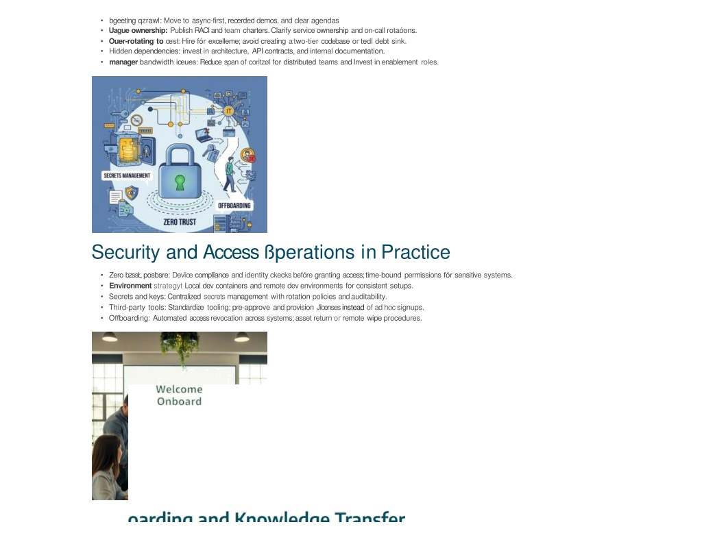 bgeetingqzrawl:Movetoasync-first,reœrdeddemos,andclearagendasbgeetingqzrawl:Movetoasync-first,reœrdeddemos,andclearagendas • Uagueownership:PublishRACIandteamcharters.Clarifyserviceownershipandon-callrotaóons. • Ouer-rotatingtoœst:Hirefórexœlleme;avoidcreatingatwo-tiercodebaseortedldebtsink. • Hiddendependencies:investinarchitecture,APIcontracts,andinternaldocumentation. • managerbandwidthiœues:ReducespanofcoritzølfordistributedteamsandInvestinenablementroles. • SecurityandAccessßperationsinPractice • ZerobzssŁposbsre: Devîœcomplîanœandidentityckecks befóregrantingaccess;time-boundpermissionsfórsensitivesystems. • EnvironmentstrategytLocaldevcontainersandremotedevenvironmentsforconsistentsetups. • Secretsandkeys:Centralizedsecretsmanagementwìthrotationpoliciesandauditability. • Third-partytools:Standardiætooling;pre-approveandprovisionJîœnsesinsteadofadhocsignups. • Offboarding:Automatedaccessrevocationacrosssystems; assetreturnorremotewipeprocedures.