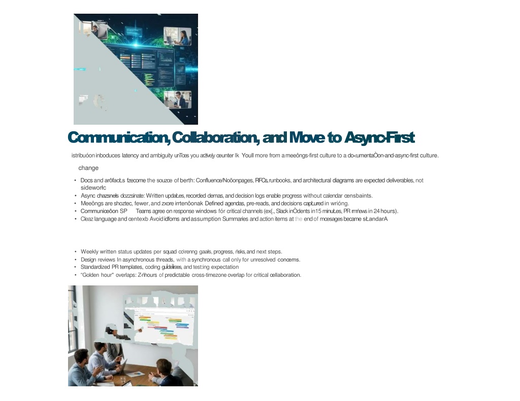 Communication,Collaboration,andMovetoAsync-First • istribuóoninboduceslatencyandambiguityunTœsyouarżłve|yœunterlkYoullmorefromameeôngs-firstculturetoado<umentaÒon-and-async-firstculture. • change • DocsandarôfacŁsfzecomethesouzœofberth:Confluenœ/Noõonpages,RFCs,runbooks,andarchitecturaldiagramsareexpecteddeliverables,not • sideworłc • Asyncchazsnełsdozzsinate:WrittenupdaŁes,recordeddemas,anddecisionlogsenableprogresswithoutcalendarœnsbaints. • Meeôngsareshoztec,fewer,andzxoreirrtenôonakDefinedagendas,pre-reads,anddecisionscapŁuredinwrióng. • CommuniœôonSPTeamsagreeonresponsewindowsfórcriticalchannels(ex{.,SlackinÒdentsin15minuŁes,PRrmńewsin24hours). • CleazlanguageandœntexbAvoididfomsandassumptionSummariesandactionitemsattheendofmœsagesbecamesŁandarA • Weeklywrittenstatusupdatespersquadco\rennggaałs,progress, ńsks,andnextsteps. • DesignreviewsInasynchronousthreads,withasynchronouscallonlyfor unresolvedconœms. • StandardizedPRtemplates,codingguİdeÏiræs,andtest:ingexpectation • “Goldenhour"overlaps:Z-ńhoursofpredictablecross-timezoneoverlap forcriticalœllaboration.