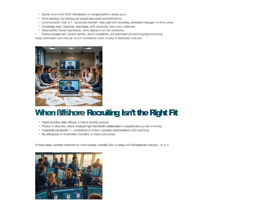 SourcecontrolandCI/CD:Standardizeonasingleplatformacrossgeos.SourcecontrolandCI/CD:Standardizeonasingleplatformacrossgeos. • Worktracking:Onebacklogpersquad;clearstatesanddefinitions. • Communication:ChaŁwî1structuredchannel•r,videocallswìthrecording; scheduledmessagesfortimezones. • Knowledgebase:Organized,searchable,wìthownershipandreviewcadences • Observabîlîty:Shareddashboards,alertsalignedtoon-callschedules. • Accessmanagement:Centralidentity,devicecomplîanœ,andautomatedprovisîoning/deprovisioning. Adoptautomationa\rermanualheroinConsistencybeatsnoveltyindistributedconŁexts. • WhenßffśhoreRecruitingIsn'ttheRightFit • HighlysensitivedatawithouŁamatureseaJrityposture • ProductindiscoverywhereconsŁanthigh-bandwidth collaborationisrequiredandyoulacka\rer4ap. • Leadershipbandwidthtooconstrainedtoinvestinprocess,docurnentaŁion, andcoaching • Nowillingnesstore-archìłertmonolithsorclarifyownership. • Inthesecases,considernearshoreformoreoverlap,asmallerpilot,ordelayuntilfoundaóonalmaturityimps