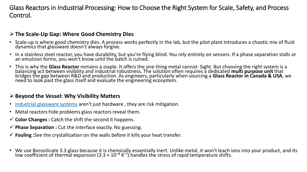 Glass Reactors in Industrial Processing: How to Choose the Right System for Scale, Safety, and Process Control. • The Scale-Up Gap: Where Good Chemistry Dies • Scale-up is where good chemistry dies. A process works perfectly in the lab, but the pilot plant introduces a chaotic mix of fluid dynamics that glassware doesn't always forgive. • In a stainless steel reactor, you have durability, but you're flying blind. You rely entirely on sensors. If a phase separation stalls or an emulsion forms, you won't know until the batch is ruined. • This is why the Glass Reactor remains a staple. It offers the one thing metal cannot: Sight. But choosing the right system is a balancing act between visibility and industrial robustness. The solution often requires a dedicated multi purpose unit that bridges the gap between R&D and production. As engineers, particularly when sourcing a Glass Reactor in Canada & USA, we need to look past the glass itself and evaluate the engineering ecosystem. • Beyond the Vessel: Why Visibility Matters • Industrial glassware systems aren't just hardware , they are risk mitigation. • Metal reactors hide problems glass reactors reveal them. • Color Changes : Catch the shift the second it happens. • Phase Separation : Cut the interface exactly. No guessing. • Fouling :See the crystallization on the walls before it kills your heat transfer. • We use Borosilicate 3.3 glass because it is chemically essentially inert. Unlike metal, it won't leach ions into your product, and its low coefficient of thermal expansion (3.3 × 10⁻⁶ K⁻¹) handles the stress of rapid temperature shifts.