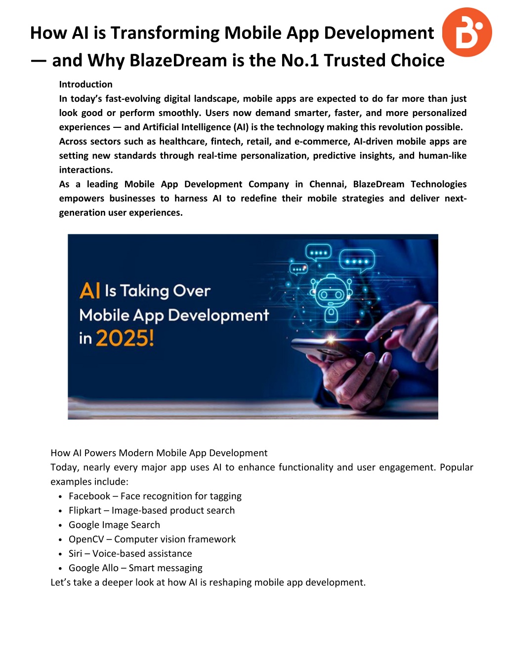1. How AI is Transforming Mobile App Development — and Why BlazeDream is the No.1 Trusted Choice Introduction In today’s fast-evolving digital landscape, mobile apps are expected to do far more than just look good or perform smoothly. Users now demand smarter, faster, and more personalized experiences — and Artificial Intelligence (AI) is the technology making this revolution possible. Across sectors such as healthcare, fintech, retail, and e-commerce, AI-driven mobile apps are setting new standards through real-time personalization, predictive insights, and human-like interactions. As a leading Mobile App Development Company in Chennai, BlazeDream Technologies empowers businesses to harness AI to redefine their mobile strategies and deliver next- generation user experiences. How AI Powers Modern Mobile App Development Today, nearly every major app uses AI to enhance functionality and user engagement. Popular examples include: Facebook – Face recognition for tagging Flipkart – Image-based product search Google Image Search OpenCV – Computer vision framework Siri – Voice-based assistance Google Allo – Smart messaging Let’s take a deeper look at how AI is reshaping mobile app development.
