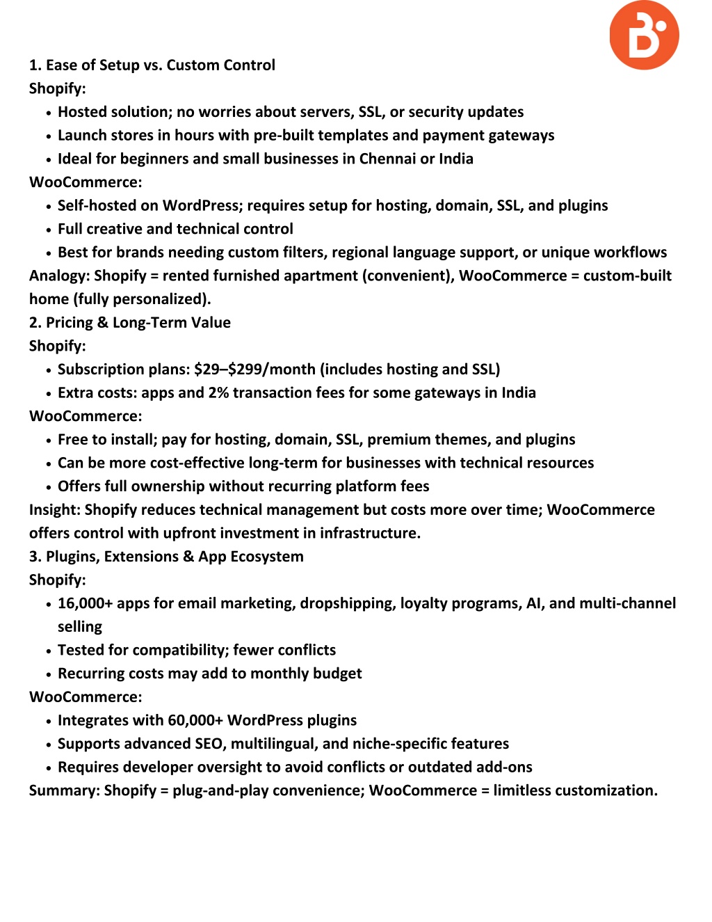 1. Ease of Setup vs. Custom Control Shopify: Hosted solution; no worries about servers, SSL, or security updates Launch stores in hours with pre-built templates and payment gateways Ideal for beginners and small businesses in Chennai or India WooCommerce: Self-hosted on WordPress; requires setup for hosting, domain, SSL, and plugins Full creative and technical control Best for brands needing custom filters, regional language support, or unique workflows Analogy: Shopify = rented furnished apartment (convenient), WooCommerce = custom-built home (fully personalized). 2. Pricing & Long-Term Value Shopify: Subscription plans: $29–$299/month (includes hosting and SSL) Extra costs: apps and 2% transaction fees for some gateways in India WooCommerce: Free to install; pay for hosting, domain, SSL, premium themes, and plugins Can be more cost-effective long-term for businesses with technical resources Offers full ownership without recurring platform fees Insight: Shopify reduces technical management but costs more over time; WooCommerce offers control with upfront investment in infrastructure. 3. Plugins, Extensions & App Ecosystem Shopify: 16,000+ apps for email marketing, dropshipping, loyalty programs, AI, and multi-channel selling Tested for compatibility; fewer conflicts Recurring costs may add to monthly budget WooCommerce: Integrates with 60,000+ WordPress plugins Supports advanced SEO, multilingual, and niche-specific features Requires developer oversight to avoid conflicts or outdated add-ons Summary: Shopify = plug-and-play convenience; WooCommerce = limitless customization.