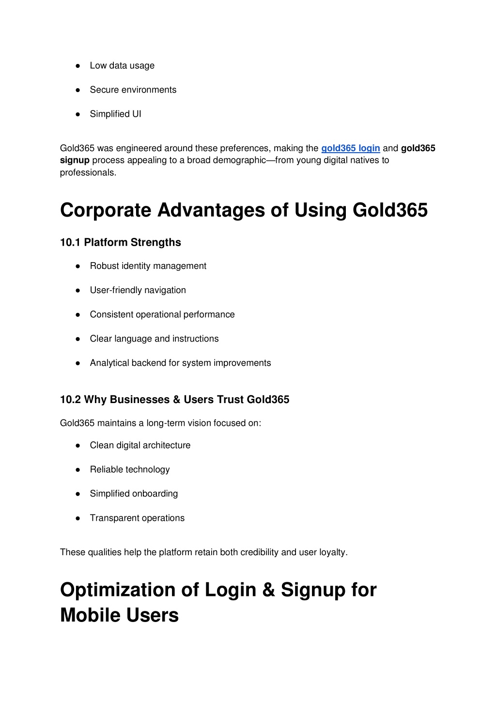 ● Low data usage ● Secure environments ● Simplified UI Gold365 was engineered around these preferences, making the gold365 login and gold365 signup process appealing to a broad demographic—from young digital natives to professionals. Corporate Advantages of Using Gold365 10.1 Platform Strengths ● Robust identity management ● User-friendly navigation ● Consistent operational performance ● Clear language and instructions ● Analytical backend for system improvements 10.2 Why Businesses & Users Trust Gold365 Gold365 maintains a long-term vision focused on: ● Clean digital architecture ● Reliable technology ● Simplified onboarding ● Transparent operations These qualities help the platform retain both credibility and user loyalty. Optimization of Login & Signup for Mobile Users