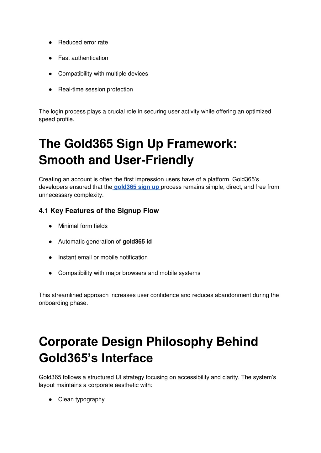 ● Reduced error rate ● Fast authentication ● Compatibility with multiple devices ● Real-time session protection The login process plays a crucial role in securing user activity while offering an optimized speed profile. The Gold365 Sign Up Framework: Smooth and User-Friendly Creating an account is often the first impression users have of a platform. Gold365’s developers ensured that the gold365 sign up process remains simple, direct, and free from unnecessary complexity. 4.1 Key Features of the Signup Flow ● Minimal form fields ● Automatic generation of gold365 id ● Instant email or mobile notification ● Compatibility with major browsers and mobile systems This streamlined approach increases user confidence and reduces abandonment during the onboarding phase. Corporate Design Philosophy Behind Gold365’s Interface Gold365 follows a structured UI strategy focusing on accessibility and clarity. The system’s layout maintains a corporate aesthetic with: ● Clean typography