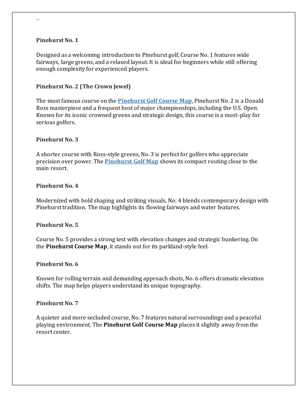 `` Pinehurst No. 1 Designed as a welcoming introduction to Pinehurst golf, Course No. 1 features wide fairways, large greens, and a relaxed layout. It is ideal for beginners while still offering enough complexity for experienced players. Pinehurst No. 2 (The Crown Jewel) The most famous course on the Pinehurst Golf Course Map, Pinehurst No. 2 is a Donald Ross masterpiece and a frequent host of major championships, including the U.S. Open. Known for its iconic crowned greens and strategic design, this course is a must-play for serious golfers. Pinehurst No. 3 A shorter course with Ross-style greens, No. 3 is perfect for golfers who appreciate precision over power. The Pinehurst Golf Map shows its compact routing close to the main resort. Pinehurst No. 4 Modernized with bold shaping and striking visuals, No. 4 blends contemporary design with Pinehurst tradition. The map highlights its flowing fairways and water features. Pinehurst No. 5 Course No. 5 provides a strong test with elevation changes and strategic bunkering. On the Pinehurst Course Map, it stands out for its parkland-style feel. Pinehurst No. 6 Known for rolling terrain and demanding approach shots, No. 6 offers dramatic elevation shifts. The map helps players understand its unique topography. Pinehurst No. 7 A quieter and more secluded course, No. 7 features natural surroundings and a peaceful playing environment. The Pinehurst Golf Course Map places it slightly away from the resort center.