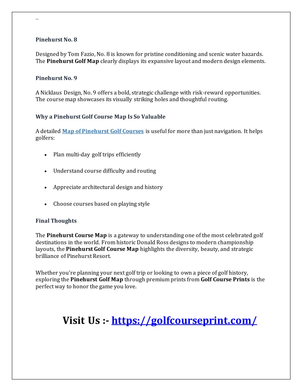 `` Pinehurst No. 8 Designed by Tom Fazio, No. 8 is known for pristine conditioning and scenic water hazards. The Pinehurst Golf Map clearly displays its expansive layout and modern design elements. Pinehurst No. 9 A Nicklaus Design, No. 9 offers a bold, strategic challenge with risk-reward opportunities. The course map showcases its visually striking holes and thoughtful routing. Why a Pinehurst Golf Course Map Is So Valuable A detailed Map of Pinehurst Golf Courses is useful for more than just navigation. It helps golfers: Plan multi-day golf trips efficiently Understand course difficulty and routing Appreciate architectural design and history Choose courses based on playing style Final Thoughts The Pinehurst Course Map is a gateway to understanding one of the most celebrated golf destinations in the world. From historic Donald Ross designs to modern championship layouts, the Pinehurst Golf Course Map highlights the diversity, beauty, and strategic brilliance of Pinehurst Resort. Whether you’re planning your next golf trip or looking to own a piece of golf history, exploring the Pinehurst Golf Map through premium prints from Golf Course Prints is the perfect way to honor the game you love. Visit Us :- https://golfcourseprint.com/