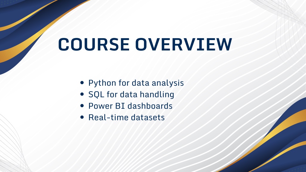 3. COURSE OVERVIEW Python for data analysis SQL for data handling Power BI dashboards Real-time datasets