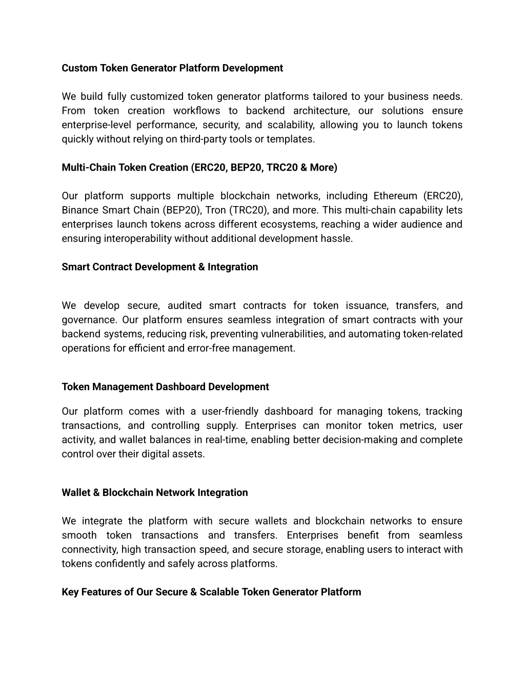 1. Enterprise-Grade Token Generator Platform Development for Secure & Scalable Token Launches Enterprises are adopting blockchain to unlock new revenue streams, enhance transparency, and streamline operations. Building tokens from scratch is costly, complex, and risky. An enterprise-grade token generator platform allows businesses to create, deploy, and manage secure, scalable tokens with ease. With multi-chain support, compliance features, and robust security, it accelerates token launches while reducing technical challenges and risks. What Is an Enterprise-Grade Token Generator Platform? An enterprise-grade token generator platform is a professional blockchain solution that allows businesses to create, deploy, and manage tokens efficiently and securely. Unlike basic token generators, it offers scalability, multi-chain compatibility, advanced security, and compliance features, making it suitable for large organizations and startups alike. Enterprises can launch tokens quickly without deep technical expertise while ensuring reliability, control, and regulatory readiness. Our Enterprise-Grade Token Generator Platform Development Services