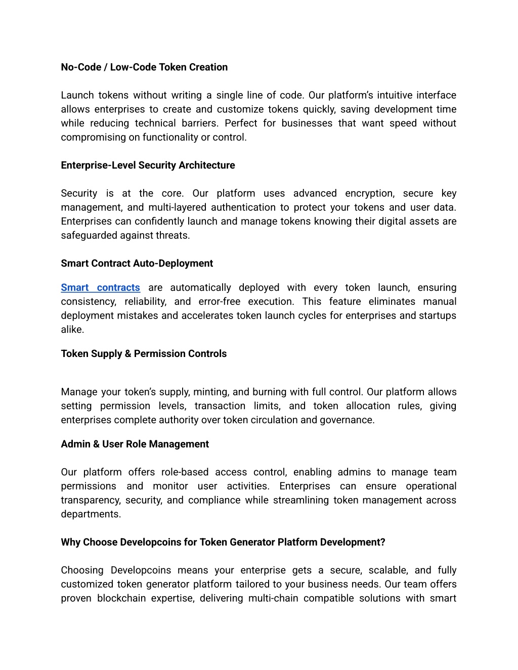 3. No-Code / Low-Code Token Creation Launch tokens without writing a single line of code. Our platform’s intuitive interface allows enterprises to create and customize tokens quickly, saving development time while reducing technical barriers. Perfect for businesses that want speed without compromising on functionality or control. Enterprise-Level Security Architecture Security is at the core. Our platform uses advanced encryption, secure key management, and multi-layered authentication to protect your tokens and user data. Enterprises can confidently launch and manage tokens knowing their digital assets are safeguarded against threats. Smart Contract Auto-Deployment Smart contracts are automatically deployed with every token launch, ensuring consistency, reliability, and error-free execution. This feature eliminates manual deployment mistakes and accelerates token launch cycles for enterprises and startups alike. Token Supply & Permission Controls Manage your token’s supply, minting, and burning with full control. Our platform allows setting permission levels, transaction limits, and token allocation rules, giving enterprises complete authority over token circulation and governance. Admin & User Role Management Our platform offers role-based access control, enabling admins to manage team permissions and monitor user activities. Enterprises can ensure operational transparency, security, and compliance while streamlining token management across departments. Why Choose Developcoins for Token Generator Platform Development? Choosing Developcoins means your enterprise gets a secure, scalable, and fully customized token generator platform tailored to your business needs. Our team offers proven blockchain expertise, delivering multi-chain compatible solutions with smart