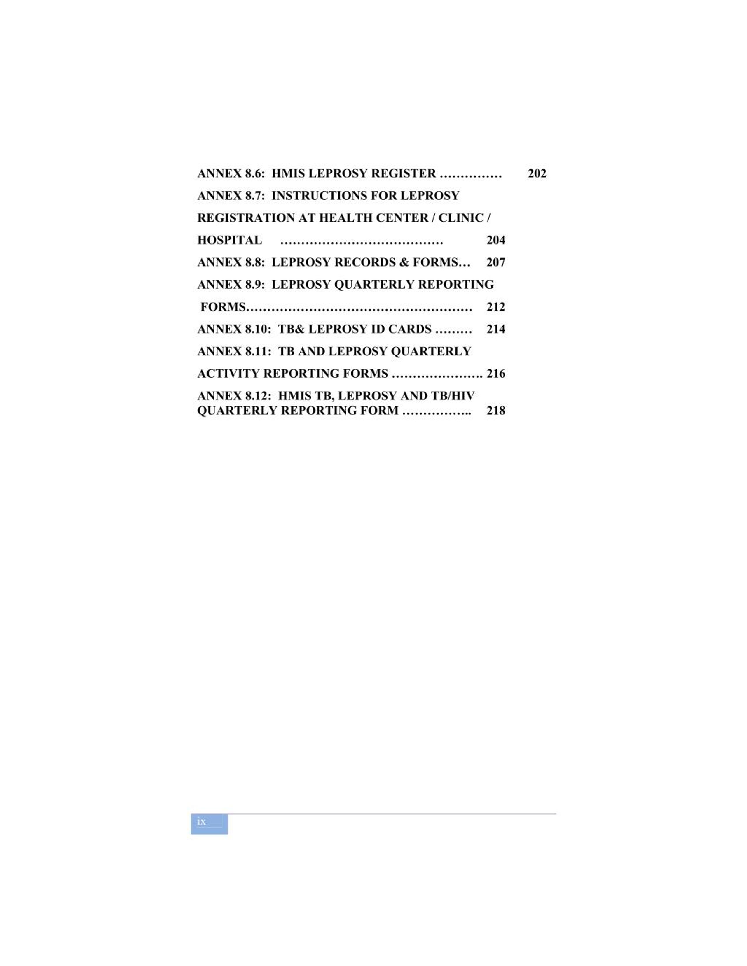 ANNEX 8.6: HMIS LEPROSY REGISTER …………… 202 ANNEX 8.7: INSTRUCTIONS FOR LEPROSY REGISTRATION AT HEALTH CENTER / CLINIC / HOSPITAL ………………………………… 204 ANNEX 8.8: LEPROSY RECORDS & FORMS… 207 ANNEX 8.9: LEPROSY QUARTERLY REPORTING FORMS……………………………………………… 212 ANNEX 8.10: TB& LEPROSY ID CARDS ……… 214 ANNEX 8.11: TB AND LEPROSY QUARTERLY ACTIVITY REPORTING FORMS …………………. 216 ANNEX 8.12: HMIS TB, LEPROSY AND TB/HIV QUARTERLY REPORTING FORM …………….. 218 ix