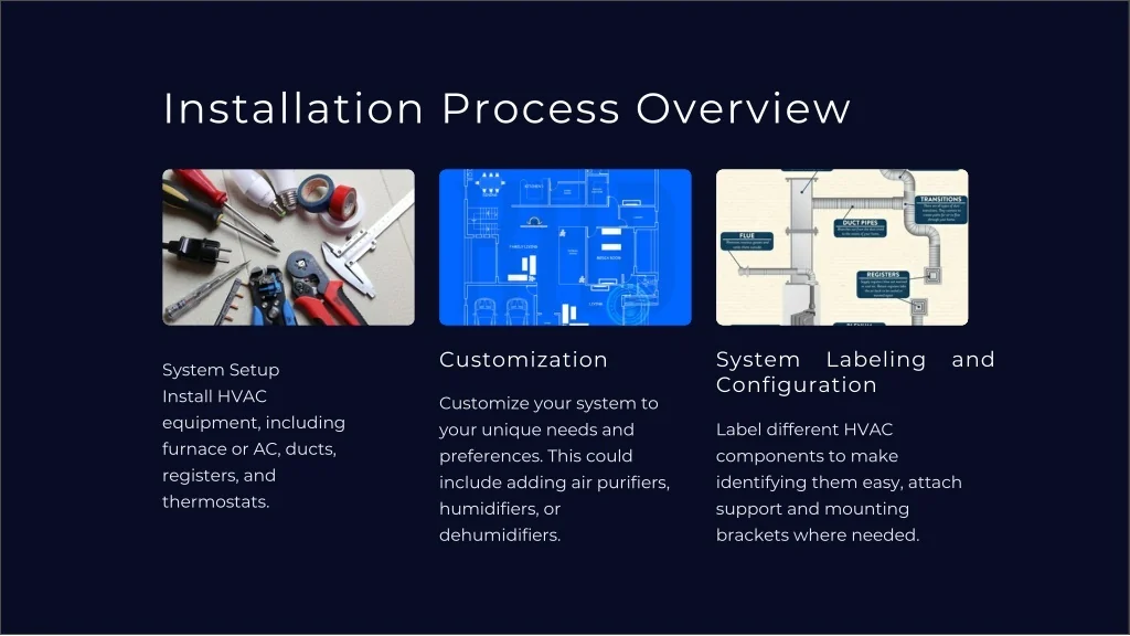 Installation Process Overview System Labeling and Configuration Customization System Setup Install HVAC equipment, including furnace or AC, ducts, registers, and thermostats. Customize your system to your unique needs and preferences. This could include adding air purifiers, humidifiers, or dehumidifiers. Label different HVAC components to make identifying them easy, attach support and mounting brackets where needed.