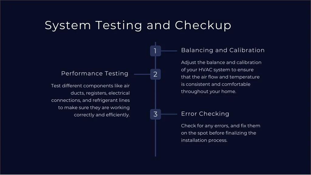 System Testing and Checkup 1 Balancing and Calibration Adjust the balance and calibration of your HVAC system to ensure that the air flow and temperature is consistent and comfortable throughout your home. Performance Testing 2 Test different components like air ducts, registers, electrical connections, and refrigerant lines to make sure they are working correctly and efficiently. 3 Error Checking Check for any errors, and fix them on the spot before finalizing the installation process.