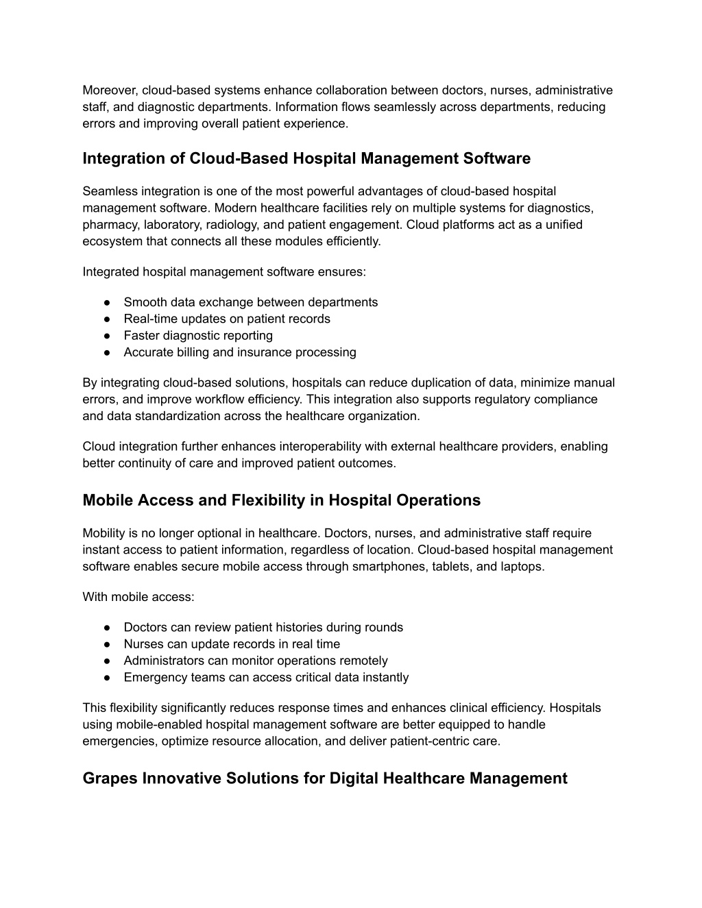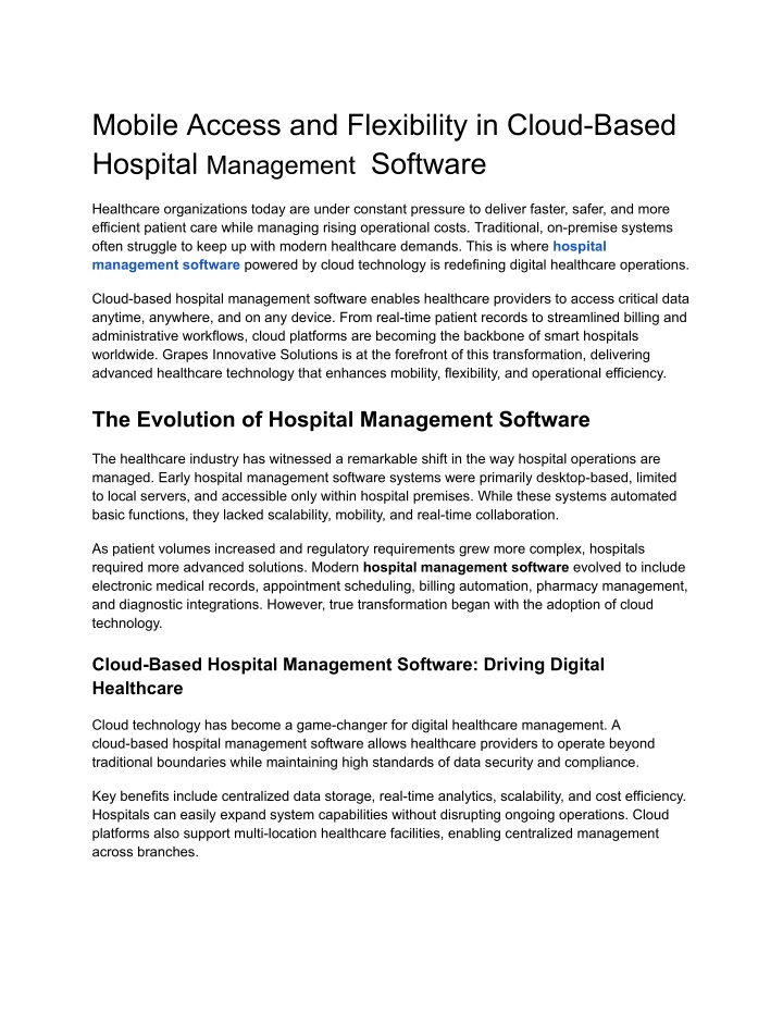 Moreover, cloud-based systems enhance collaboration between doctors, nurses, administrative staff, and diagnostic departments. Information flows seamlessly across departments, reducing errors and improving overall patient experience. Integration of Cloud-Based Hospital Management Software Seamless integration is one of the most powerful advantages of cloud-based hospital management software. Modern healthcare facilities rely on multiple systems for diagnostics, pharmacy, laboratory, radiology, and patient engagement. Cloud platforms act as a unified ecosystem that connects all these modules efficiently. Integrated hospital management software ensures: ● Smooth data exchange between departments ● Real-time updates on patient records ● Faster diagnostic reporting ● Accurate billing and insurance processing By integrating cloud-based solutions, hospitals can reduce duplication of data, minimize manual errors, and improve workflow efficiency. This integration also supports regulatory compliance and data standardization across the healthcare organization. Cloud integration further enhances interoperability with external healthcare providers, enabling better continuity of care and improved patient outcomes. Mobile Access and Flexibility in Hospital Operations Mobility is no longer optional in healthcare. Doctors, nurses, and administrative staff require instant access to patient information, regardless of location. Cloud-based hospital management software enables secure mobile access through smartphones, tablets, and laptops. With mobile access: ● Doctors can review patient histories during rounds ● Nurses can update records in real time ● Administrators can monitor operations remotely ● Emergency teams can access critical data instantly This flexibility significantly reduces response times and enhances clinical efficiency. Hospitals using mobile-enabled hospital management software are better equipped to handle emergencies, optimize resource allocation, and deliver patient-centric care. Grapes Innovative Solutions for Digital Healthcare Management