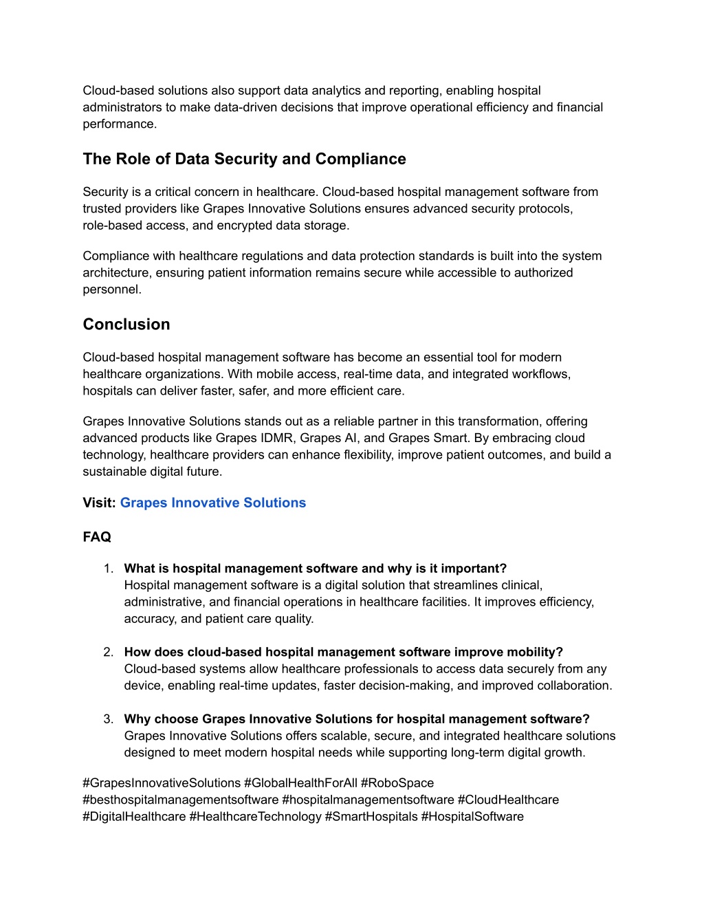 Cloud-based solutions also support data analytics and reporting, enabling hospital administrators to make data-driven decisions that improve operational efficiency and financial performance. The Role of Data Security and Compliance Security is a critical concern in healthcare. Cloud-based hospital management software from trusted providers like Grapes Innovative Solutions ensures advanced security protocols, role-based access, and encrypted data storage. Compliance with healthcare regulations and data protection standards is built into the system architecture, ensuring patient information remains secure while accessible to authorized personnel. Conclusion Cloud-based hospital management software has become an essential tool for modern healthcare organizations. With mobile access, real-time data, and integrated workflows, hospitals can deliver faster, safer, and more efficient care. Grapes Innovative Solutions stands out as a reliable partner in this transformation, offering advanced products like Grapes IDMR, Grapes AI, and Grapes Smart. By embracing cloud technology, healthcare providers can enhance flexibility, improve patient outcomes, and build a sustainable digital future. Visit: Grapes Innovative Solutions FAQ 1. What is hospital management software and why is it important? Hospital management software is a digital solution that streamlines clinical, administrative, and financial operations in healthcare facilities. It improves efficiency, accuracy, and patient care quality. 2. How does cloud-based hospital management software improve mobility? Cloud-based systems allow healthcare professionals to access data securely from any device, enabling real-time updates, faster decision-making, and improved collaboration. 3. Why choose Grapes Innovative Solutions for hospital management software? Grapes Innovative Solutions offers scalable, secure, and integrated healthcare solutions designed to meet modern hospital needs while supporting long-term digital growth. #GrapesInnovativeSolutions #GlobalHealthForAll #RoboSpace #besthospitalmanagementsoftware #hospitalmanagementsoftware #CloudHealthcare #DigitalHealthcare #HealthcareTechnology #SmartHospitals #HospitalSoftware