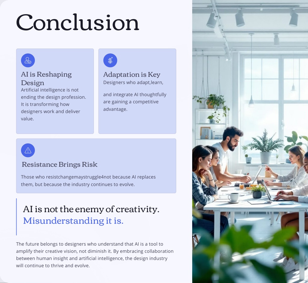 Conclusion AIisReshaping Design Artificial intelligence is not ending the design profession. It is transforming how designers work and deliver value. AdaptationisKey Designers who adapt,learn, and integrate AI thoughtfully are gaining a competitive advantage. Resistance Brings Risk Those who resistchangemaystruggle4not because AI replaces them, but because the industry continues to evolve. AI is not the enemy of creativity. Misunderstanding it is. The future belongs to designers who understand that AI is a tool to amplify their creative vision, not diminish it. By embracing collaboration between human insight and artificial intelligence, the design industry will continue to thrive and evolve.