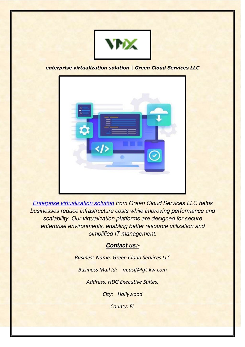 enterprise virtualization solution | Green Cloud Services LLC Enterprise virtualization solution from Green Cloud Services LLC helps businesses reduce infrastructure costs while improving performance and scalability. Our virtualization platforms are designed for secure enterprise environments, enabling better resource utilization and simplified IT management. Contact us:- Business Name: Green Cloud Services LLC Business Mail Id: m.asif@gt-kw.com Address: HDG Executive Suites, City: Hollywood County: FL