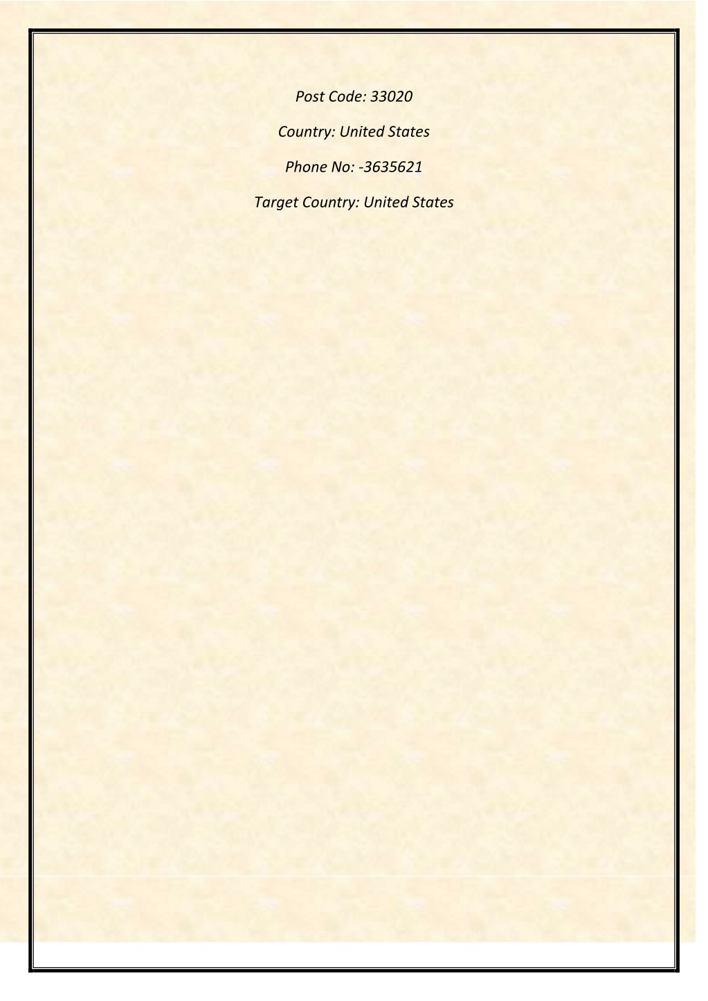 Post Code: 33020 Country: United States Phone No: -3635621 Target Country: United States