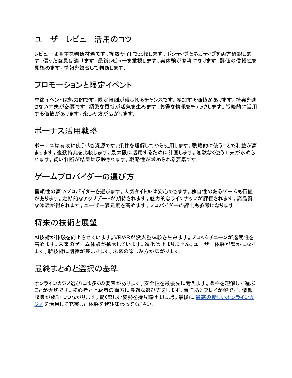 ユーザーレビュー活用のコツ レビューは貴重な判断材料です。複数サイトで比較します。ポジティブとネガティブを両方確認しま す。偏った意見は避けます。最新レビューを重視します。実体験が参考になります。評価の信頼性を 見極めます。情報を総合して判断します. プロモーションと限定イベント 季節イベントは魅力的です。限定報酬が得られるチャンスです。参加する価値があります。特典を逃 さない工夫が必要です。頻繁な更新が活気を生みます。お得な情報をチェックします。戦略的に活用 する価値があります。楽しみ方が広がります. ボーナス活用戦略 ボーナスは有効に使うべき資源です。条件を理解してから使用します。戦略的に使うことで利益が高 まります。複数特典を比較します。最大限に活用するために計画します。無駄なく使う工夫が求めら れます。賢い判断が結果に反映されます。戦略性が求められる要素です. ゲームプロバイダーの選び方 信頼性の高いプロバイダーを選びます。人気タイトルは安心できます。独自性のあるゲームも価値 があります。定期的なアップデートが期待されます。魅力的なラインナップが評価されます。高品質 な体験が得られます。ユーザー満足度を高めます。プロバイダーの評判も参考になります. 将来の技術と展望 AI技術が体験を向上させています。VR/ARが没入型体験を生みます。ブロックチェーンが透明性を 高めます。未来のゲーム体験が拡大しています。進化は止まりません。ユーザー体験が豊かになり ます。新技術に期待が集まります。未来の楽しみ方が広がります. 最終まとめと選択の基準 オンラインカジノ選びには多くの要素があります。安全性を最優先に考えます。条件を理解して遊ぶ ことが大切です。初心者と上級者の両方に最適な選び方をします。責任あるプレイが鍵です。情報 収集が成功につながります。賢く楽しむ姿勢を持ち続けましょう。最後に最高の新しいオンラインカ ジノを活用して充実した体験をぜひ味わってください。