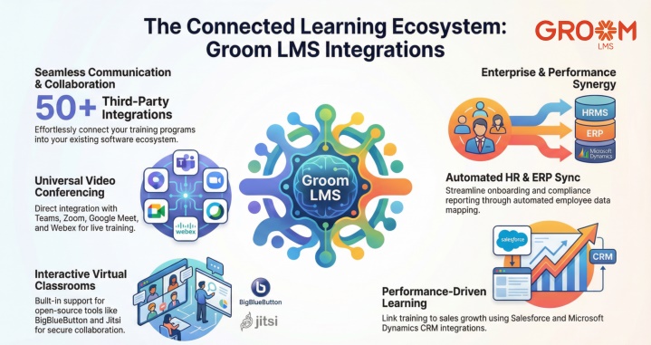 Groom LMS is a sophisticated learning management system designed to modernize organizational training through a highly interconnected ecosystem. The platform distinguishes itself by offering over fifty third-party integrations, allowing users to link their educational efforts with existing tools like Microsoft Teams, Zoom, and Salesforce.