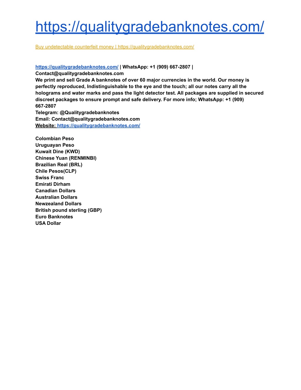 https://qualitygradebanknotes.com/ Buy undetectable counterfeit money | https://qualitygradebanknotes.com/ https://qualitygradebanknotes.com/ | WhatsApp: +1 (909) 667-2807 | Contact@qualitygradebanknotes.com We print and sell Grade A banknotes of over 60 major currencies in the world. Our money is perfectly reproduced, Indistinguishable to the eye and the touch; all our notes carry all the holograms and water marks and pass the light detector test. All packages are supplied in secured discreet packages to ensure prompt and safe delivery. For more info; WhatsApp: +1 (909) 667-2807 Telegram: @Qualitygradebanknotes Email: Contact@qualitygradebanknotes.com Website: https://qualitygradebanknotes.com/ Colombian Peso Uruguayan Peso Kuwait Dine (KWD) Chinese Yuan (RENMINBI) Brazilian Real (BRL) Chile Pesos(CLP) Swiss Franc Emirati Dirham Canadian Dollars Australian Dollars Newzealand Dollars British pound sterling (GBP) Euro Banknotes USA Dollar
