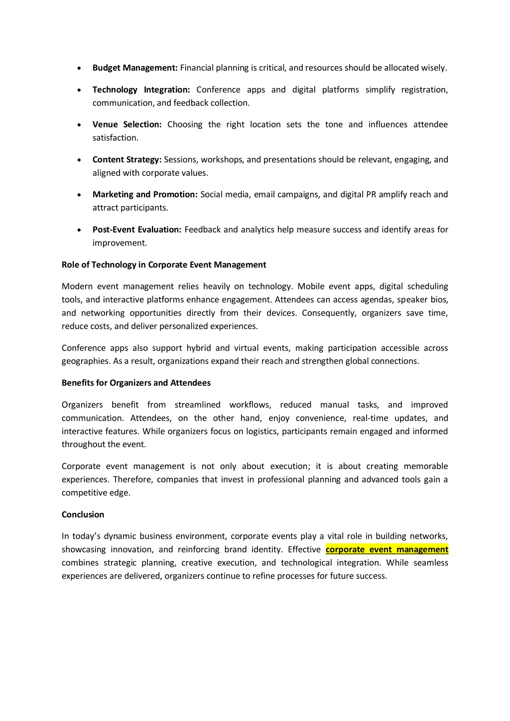 Budget Management: Financial planning is critical, and resources should be allocated wisely. Technology Integration: Conference apps and digital platforms simplify registration, communication, and feedback collection. Venue Selection: Choosing the right location sets the tone and influences attendee satisfaction. Content Strategy: Sessions, workshops, and presentations should be relevant, engaging, and aligned with corporate values. Marketing and Promotion: Social media, email campaigns, and digital PR amplify reach and attract participants. Post-Event Evaluation: Feedback and analytics help measure success and identify areas for improvement. Role of Technology in Corporate Event Management Modern event management relies heavily on technology. Mobile event apps, digital scheduling tools, and interactive platforms enhance engagement. Attendees can access agendas, speaker bios, and networking opportunities directly from their devices. Consequently, organizers save time, reduce costs, and deliver personalized experiences. Conference apps also support hybrid and virtual events, making participation accessible across geographies. As a result, organizations expand their reach and strengthen global connections. Benefits for Organizers and Attendees Organizers benefit from streamlined workflows, reduced manual tasks, and improved communication. Attendees, on the other hand, enjoy convenience, real-time updates, and interactive features. While organizers focus on logistics, participants remain engaged and informed throughout the event. Corporate event management is not only about execution; it is about creating memorable experiences. Therefore, companies that invest in professional planning and advanced tools gain a competitive edge. Conclusion In today’s dynamic business environment, corporate events play a vital role in building networks, showcasing innovation, and reinforcing brand identity. Effective corporate event management combines strategic planning, creative execution, and technological integration. While seamless experiences are delivered, organizers continue to refine processes for future success.