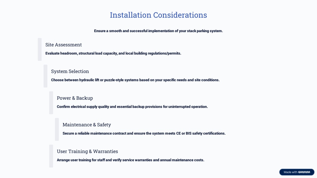 Installation Considerations Ensure a smooth and successful implementation of your stack parking system. Site Assessment Evaluate headroom, structural load capacity, and local building regulations/permits. System Selection Choose between hydraulic lift or puzzle-style systems based on your specific needs and site conditions. Power & Backup Confirm electrical supply quality and essential backup provisions for uninterrupted operation. Maintenance & Safety Secure a reliable maintenance contract and ensure the system meets CE or BIS safety certifications. User Training & Warranties Arrange user training for staff and verify service warranties and annual maintenance costs.