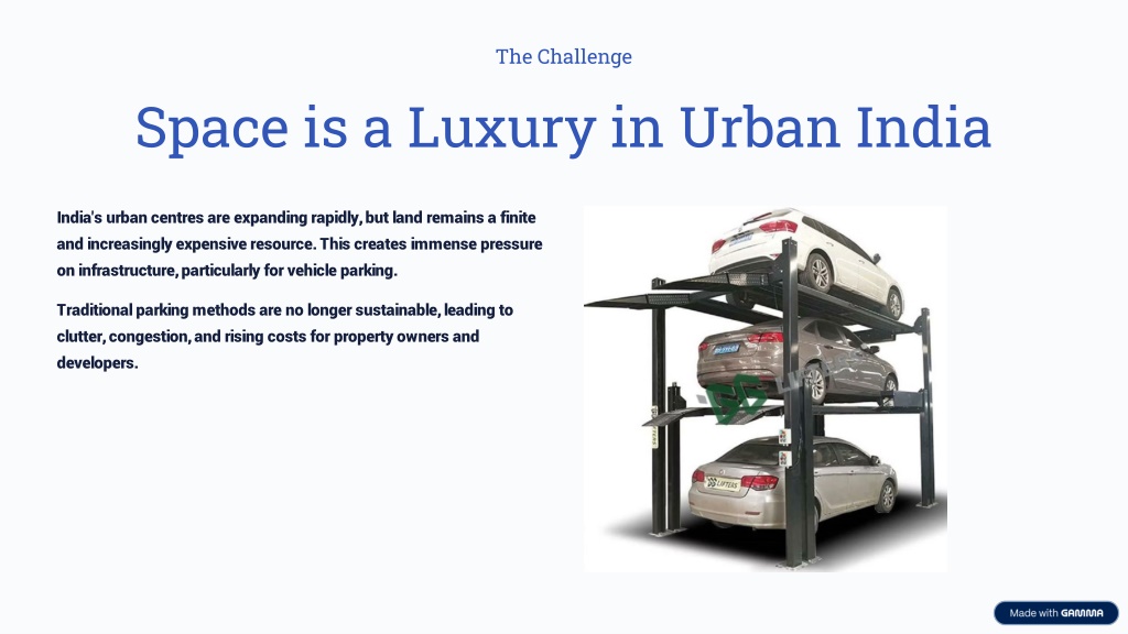 The Challenge Space is a Luxury in Urban India India's urban centres are expanding rapidly, but land remains a finite and increasingly expensive resource. This creates immense pressure on infrastructure, particularly for vehicle parking. Traditional parking methods are no longer sustainable, leading to clutter, congestion, and rising costs for property owners and developers.