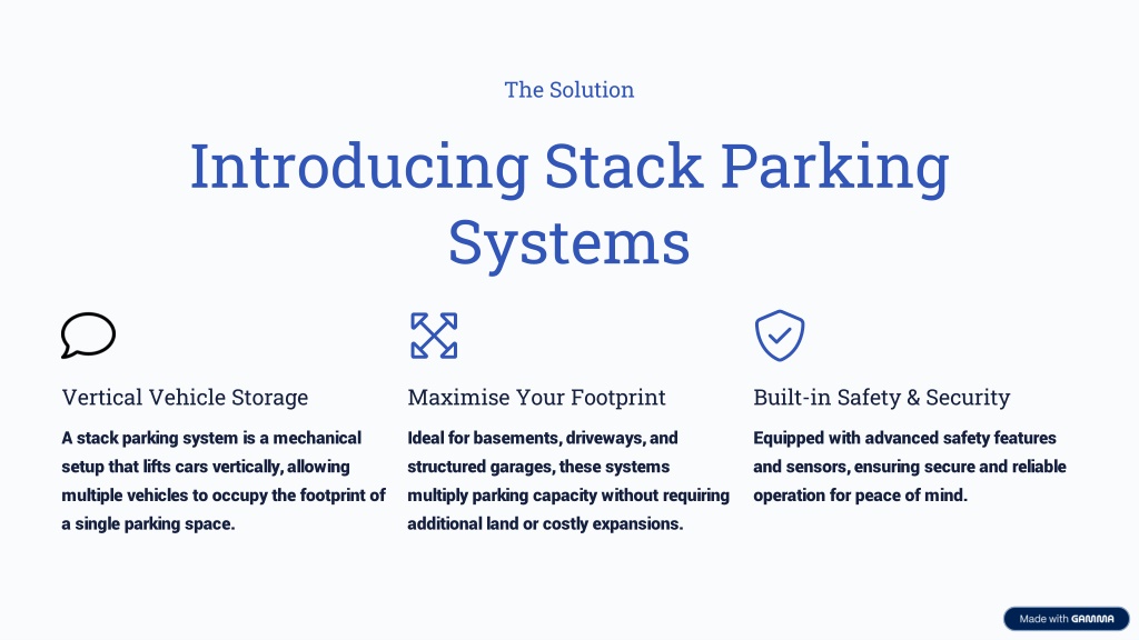 The Solution Introducing Stack Parking Systems Vertical Vehicle Storage Maximise Your Footprint Built-in Safety & Security A stack parking system is a mechanical setup that lifts cars vertically, allowing multiple vehicles to occupy the footprint of a single parking space. Ideal for basements, driveways, and structured garages, these systems multiply parking capacity without requiring additional land or costly expansions. Equipped with advanced safety features and sensors, ensuring secure and reliable operation for peace of mind.