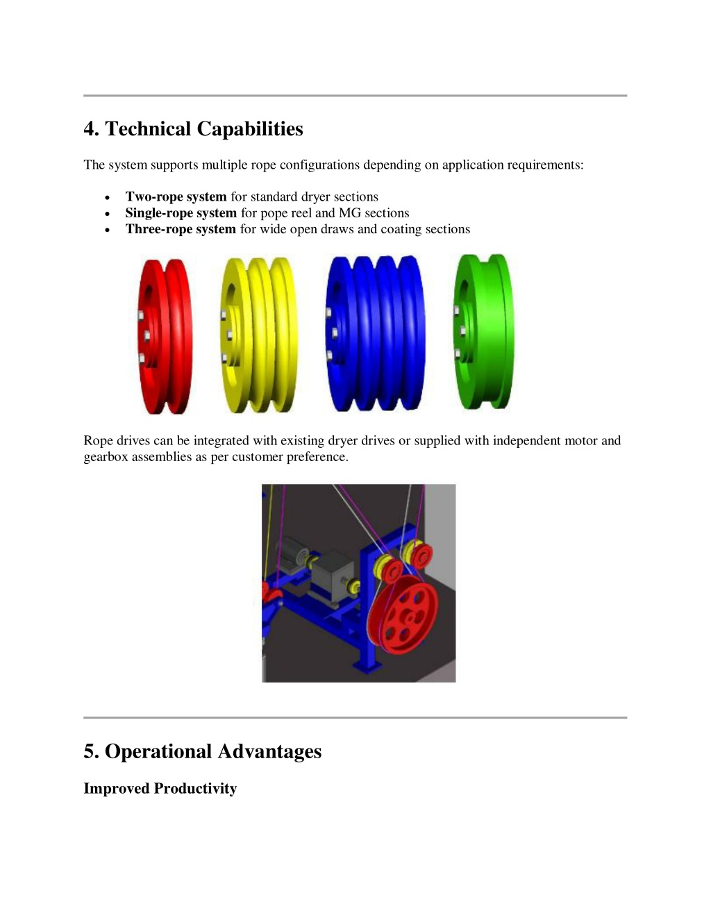 3. 4. Technical Capabilities The system supports multiple rope configurations depending on application requirements: Two-rope system for standard dryer sections Single-rope system for pope reel and MG sections Three-rope system for wide open draws and coating sections Rope drives can be integrated with existing dryer drives or supplied with independent motor and gearbox assemblies as per customer preference. 5. Operational Advantages Improved Productivity