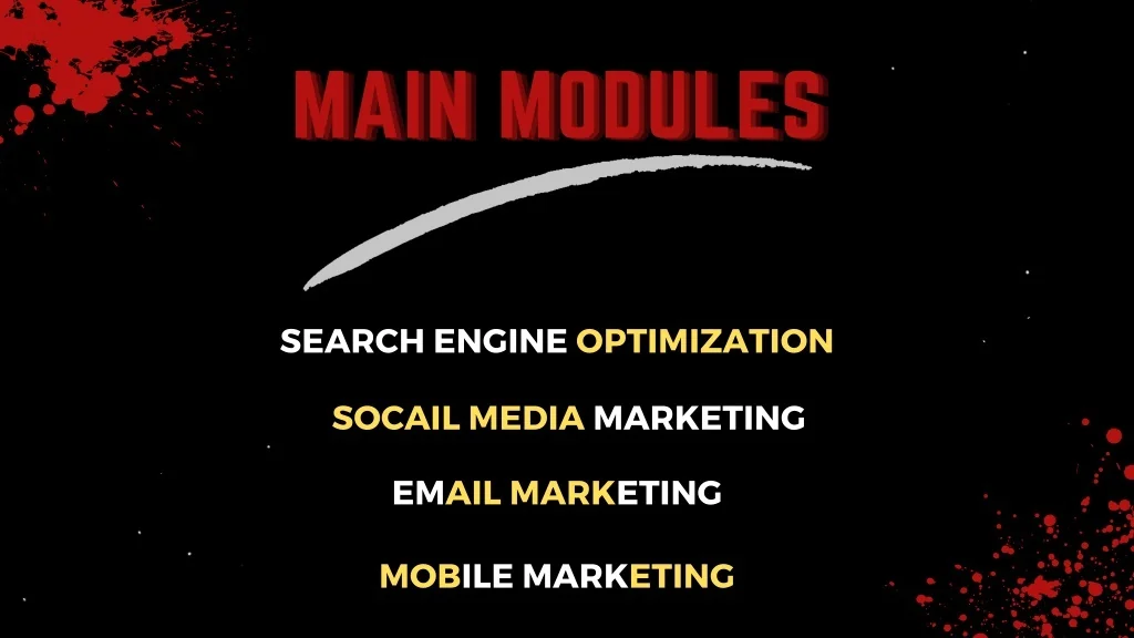 MAIN MODULES MAIN MODULES MAIN MODULES SEARCH ENGINE OPTIMIZATION SOCAIL MEDIA MARKETING EMAIL MARKETING MOBILE MARKETING