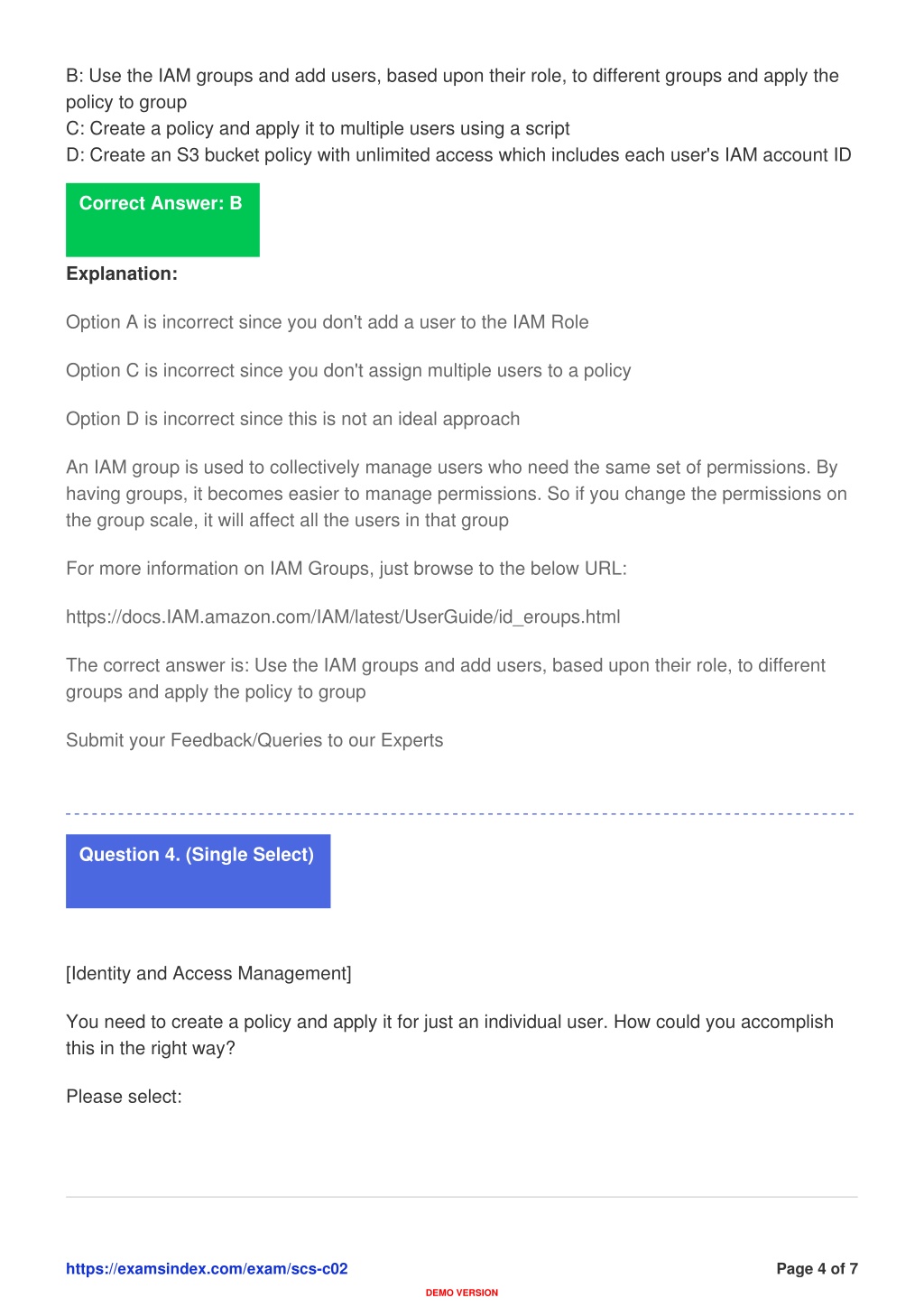 B: Use the IAM groups and add users, based upon their role, to different groups and apply the policy to group C: Create a policy and apply it to multiple users using a script D: Create an S3 bucket policy with unlimited access which includes each user's IAM account ID Correct Answer: B Explanation: Option A is incorrect since you don't add a user to the IAM Role Option C is incorrect since you don't assign multiple users to a policy Option D is incorrect since this is not an ideal approach An IAM group is used to collectively manage users who need the same set of permissions. By having groups, it becomes easier to manage permissions. So if you change the permissions on the group scale, it will affect all the users in that group For more information on IAM Groups, just browse to the below URL: https://docs.IAM.amazon.com/IAM/latest/UserGuide/id_eroups.html The correct answer is: Use the IAM groups and add users, based upon their role, to different groups and apply the policy to group Submit your Feedback/Queries to our Experts Question 4. (Single Select) [Identity and Access Management] You need to create a policy and apply it for just an individual user. How could you accomplish this in the right way? Please select: https://examsindex.com/exam/scs-c02 Page 4 of 7 DEMO VERSION