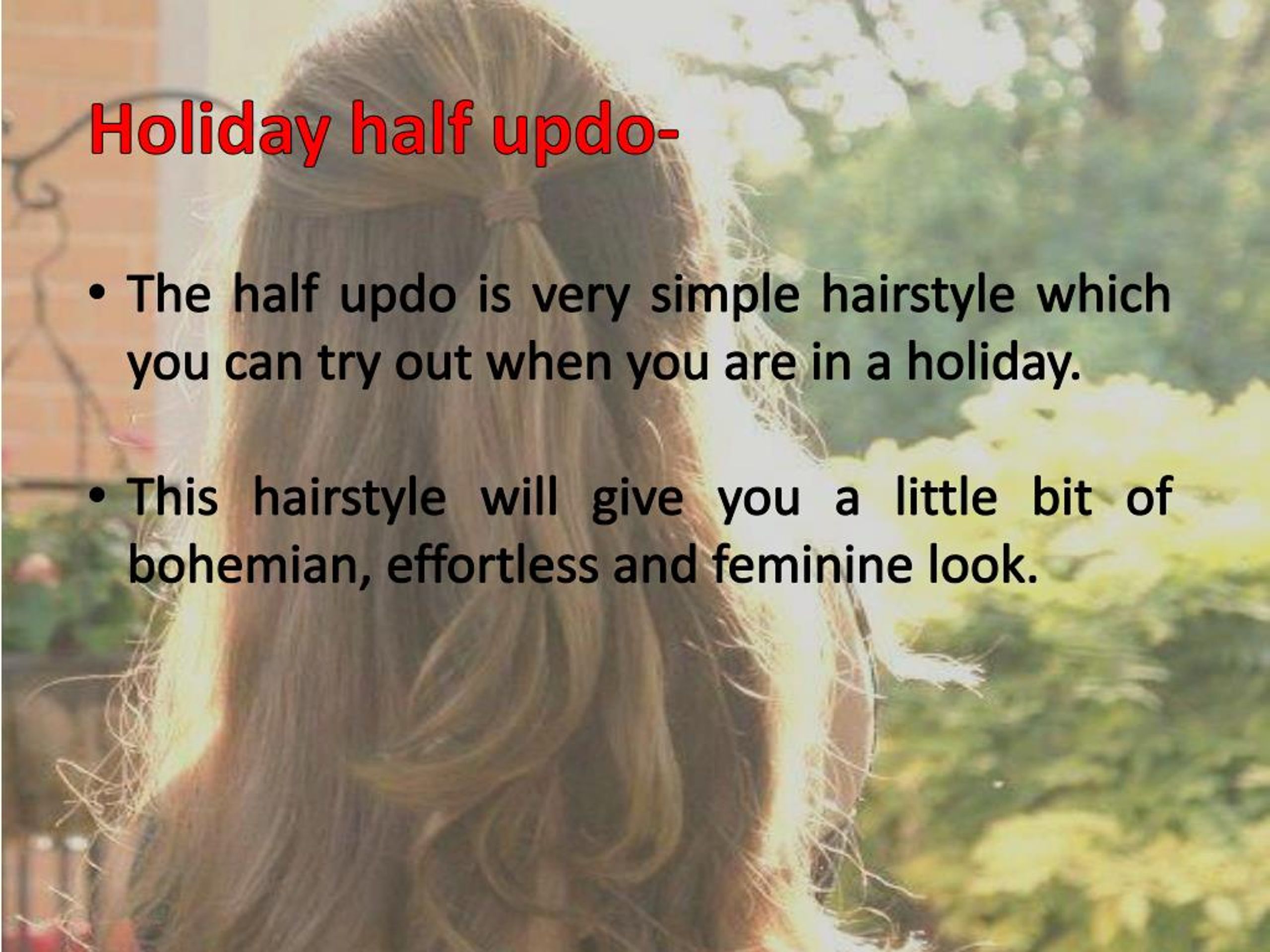 Holiday half updo- • The half updo is very simple hairstyle which you can try out when you are in a holiday. • This hairstyle will give you a little bit of bohemian, effortless and feminine look.