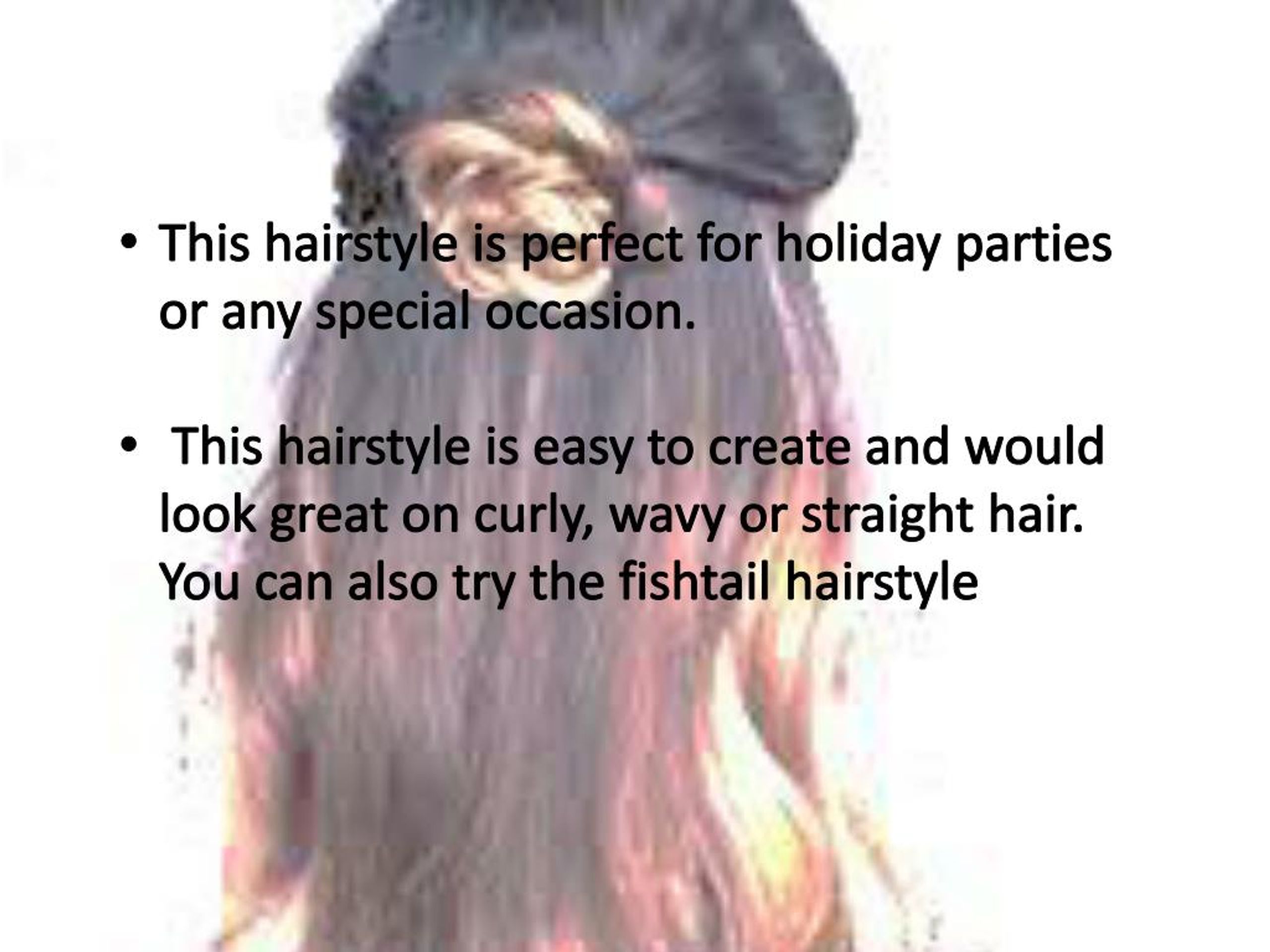 This hairstyle is perfect for holiday parties or any special occasion. • This hairstyle is easy to create and would look great on curly, wavy or straight hair. You can also try the fishtail hairstyle