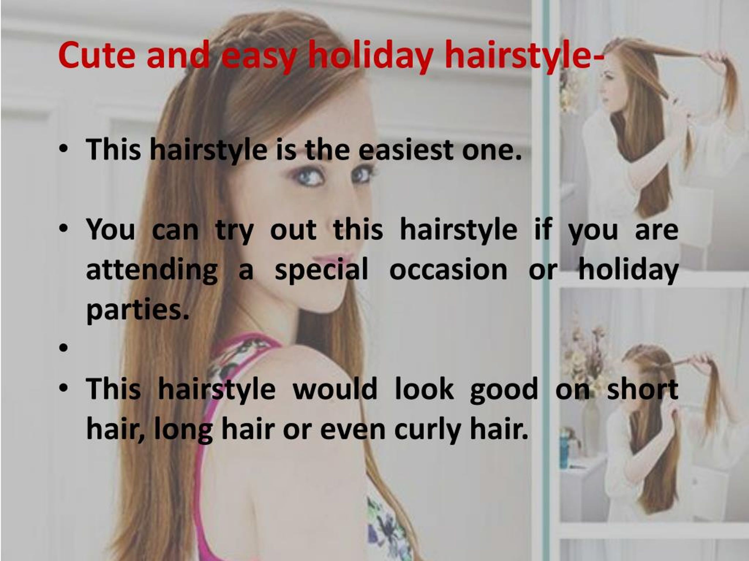 Cute and easy holiday hairstyle- • This hairstyle is the easiest one. • You can try out this hairstyle if you are attending a special occasion or holiday parties. • This hairstyle would look good on short hair, long hair or even curly hair.