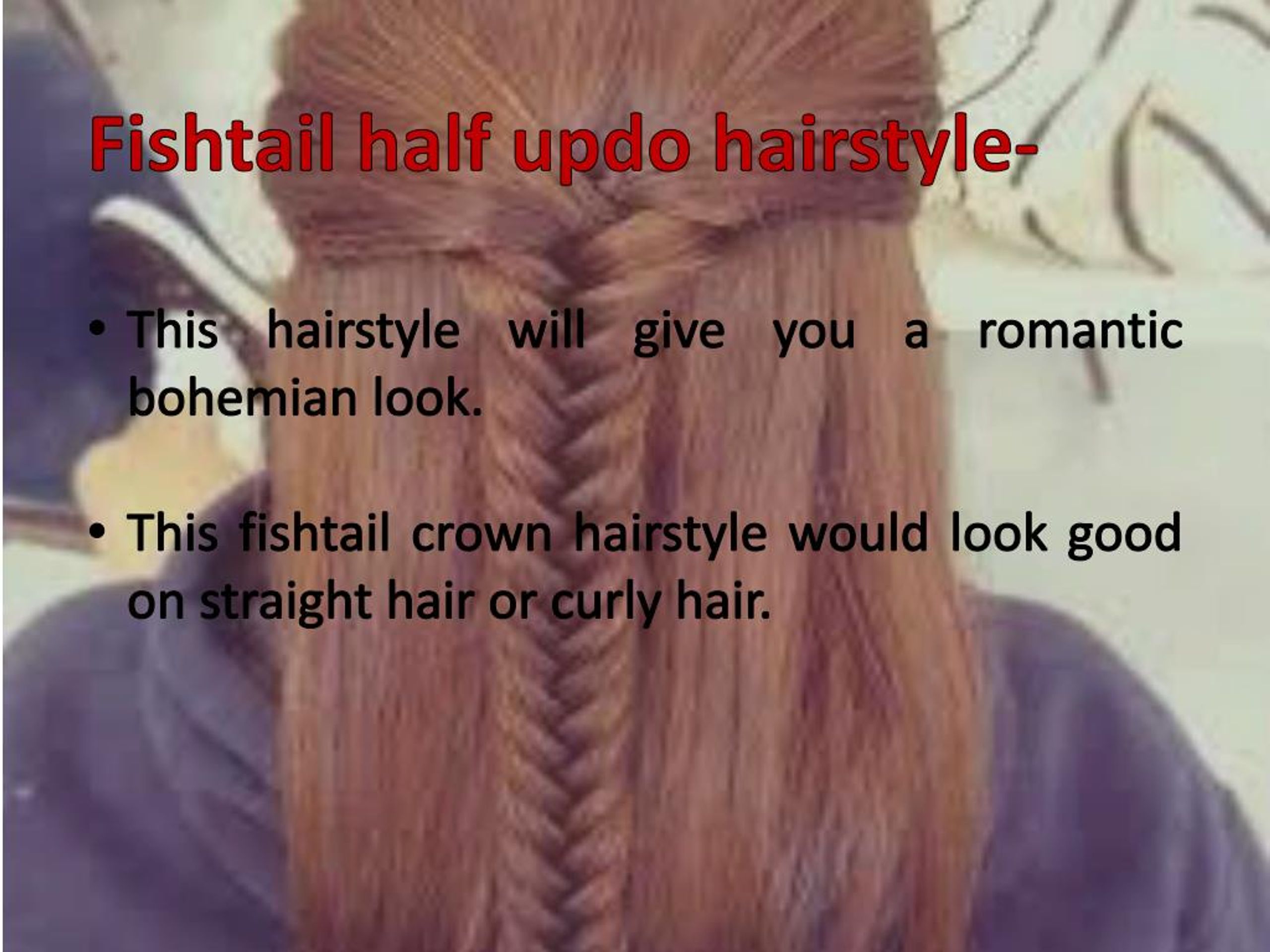 Fishtail half updo hairstyle- • This hairstyle will give you a romantic bohemian look. • This fishtail crown hairstyle would look good on straight hair or curly hair.