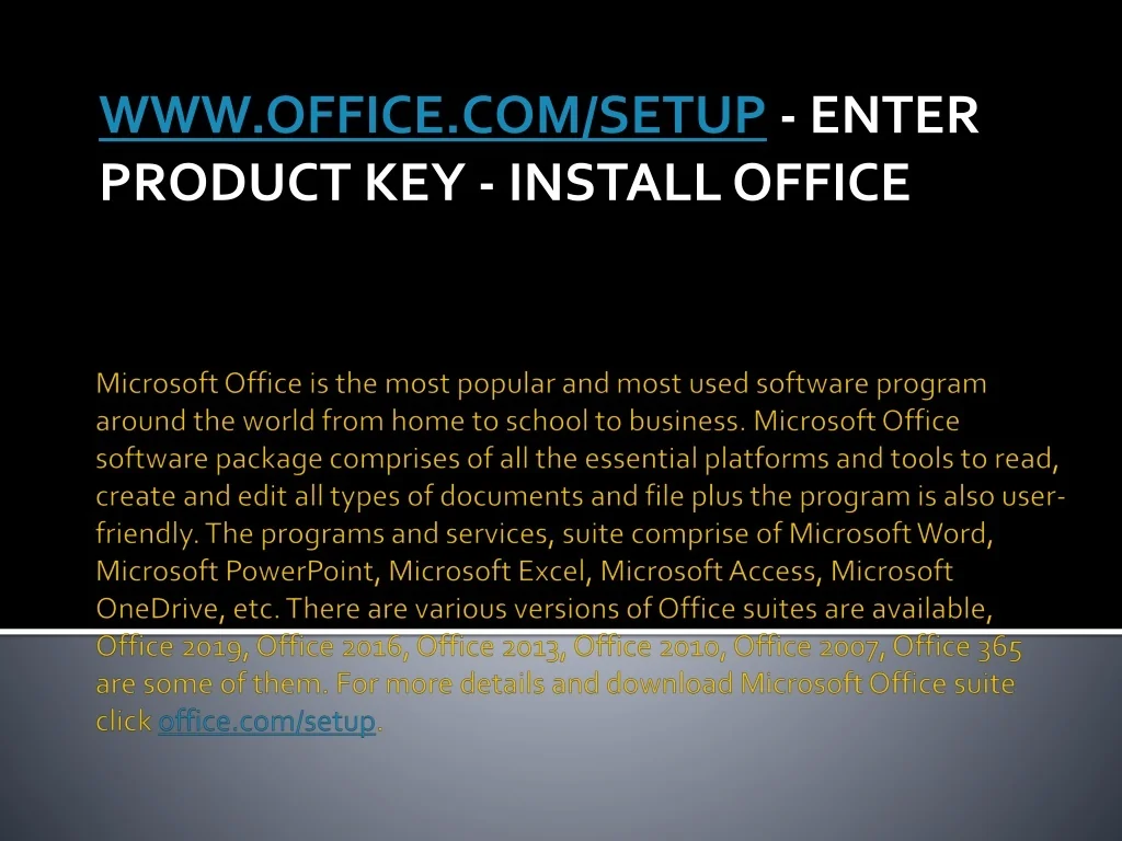 WWW.OFFICE.COM/SETUP - ENTER PRODUCT KEY - INSTALL OFFICE Microsoft Office is the most popular and most used software program around the world from home to school to business. Microsoft Office software package comprises of all the essential platforms and tools to read, create and edit all types of documents and file plus the program is also user-friendly. The programs and services, suite comprise of Microsoft Word, Microsoft PowerPoint, Microsoft Excel, Microsoft Access, Microsoft OneDrive, etc. There are various versions of Office suites are available, Office 2019, Office 2016, Office 2013, Office 2010, Office 2007, Office 365 are some of them. For more details and download Microsoft Office suite click office.com/setup.