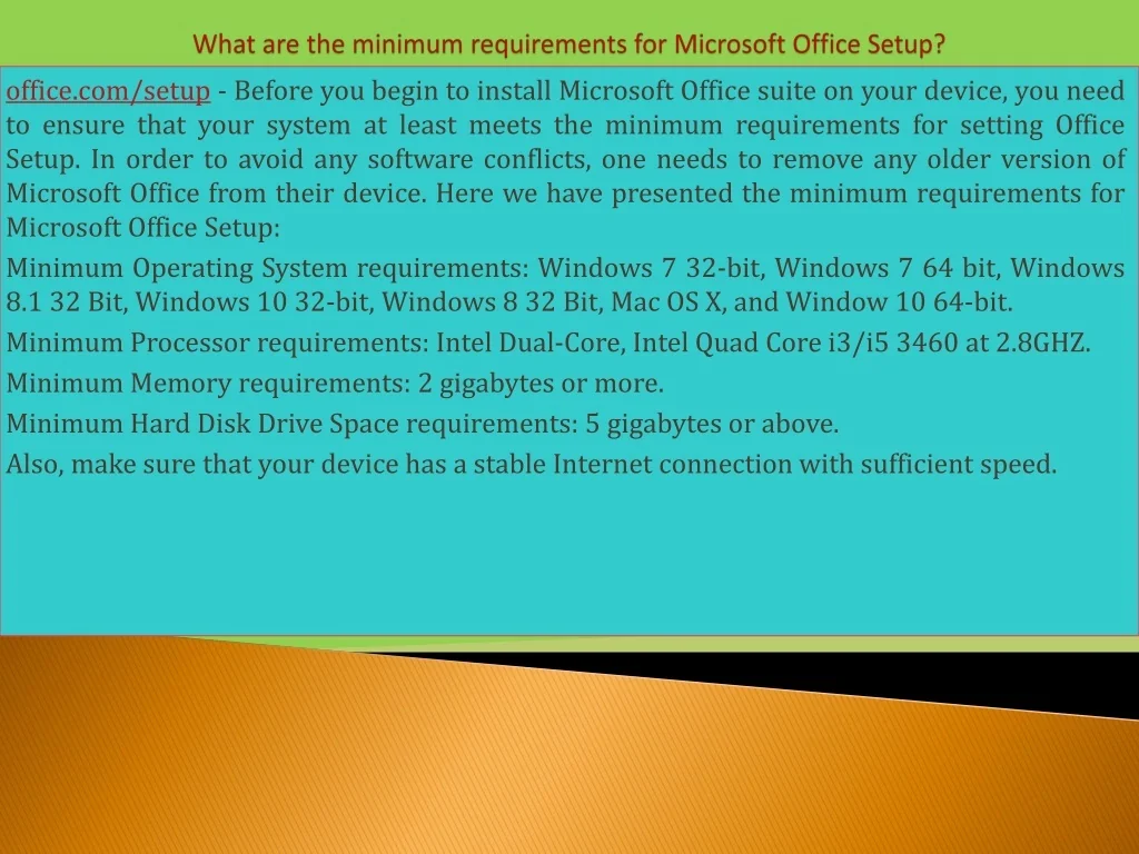 What are the minimum requirements for Microsoft Office Setup? office.com/setup - Before you begin to install Microsoft Office suite on your device, you need to ensure that your system at least meets the minimum requirements for setting Office Setup. In order to avoid any software conflicts, one needs to remove any older version of Microsoft Office from their device. Here we have presented the minimum requirements for Microsoft Office Setup: Minimum Operating System requirements: Windows 7 32-bit, Windows 7 64 bit, Windows 8.1 32 Bit, Windows 10 32-bit, Windows 8 32 Bit, Mac OS X, and Window 10 64-bit. Minimum Processor requirements: Intel Dual-Core, Intel Quad Core i3/i5 3460 at 2.8GHZ. Minimum Memory requirements: 2 gigabytes or more. Minimum Hard Disk Drive Space requirements: 5 gigabytes or above. Also, make sure that your device has a stable Internet connection with sufficient speed.