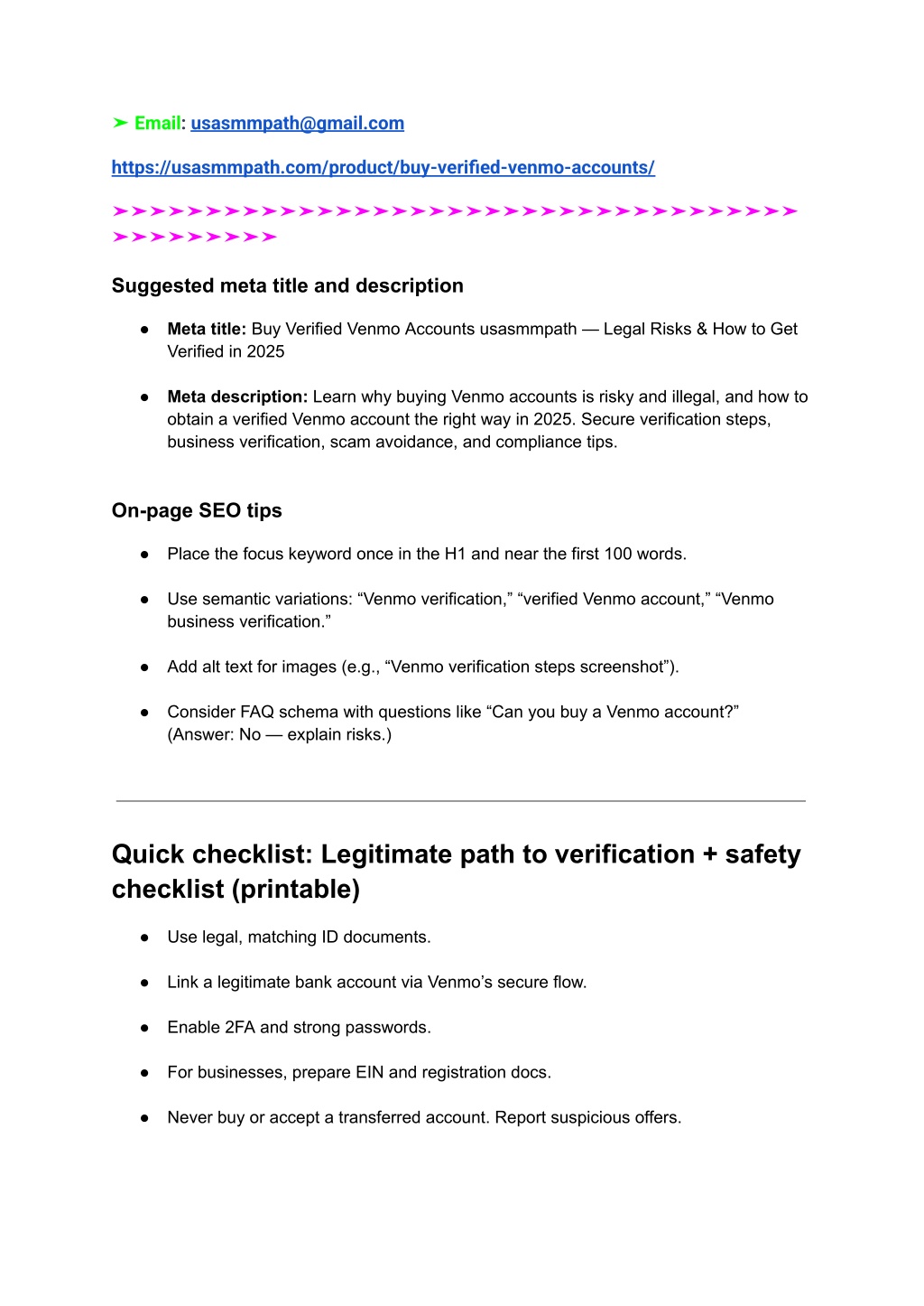 ➤ Email: usasmmpath@gmail.com https://usasmmpath.com/product/buy-verified-venmo-accounts/ ➤➤➤➤➤➤➤➤➤➤➤➤➤➤➤➤➤➤➤➤➤➤➤➤➤➤➤➤➤➤➤➤➤➤➤➤➤ ➤➤➤➤➤➤➤➤➤ Suggested meta title and description ● Meta title: Buy Verified Venmo Accounts usasmmpath — Legal Risks & How to Get Verified in 2025 ● Meta description: Learn why buying Venmo accounts is risky and illegal, and how to obtain a verified Venmo account the right way in 2025. Secure verification steps, business verification, scam avoidance, and compliance tips. On-page SEO tips ● Place the focus keyword once in the H1 and near the first 100 words. ● Use semantic variations: “Venmo verification,” “verified Venmo account,” “Venmo business verification.” ● Add alt text for images (e.g., “Venmo verification steps screenshot”). ● Consider FAQ schema with questions like “Can you buy a Venmo account?” (Answer: No — explain risks.) Quick checklist: Legitimate path to verification + safety checklist (printable) ● Use legal, matching ID documents. ● Link a legitimate bank account via Venmo’s secure flow. ● Enable 2FA and strong passwords. ● For businesses, prepare EIN and registration docs. ● Never buy or accept a transferred account. Report suspicious offers.
