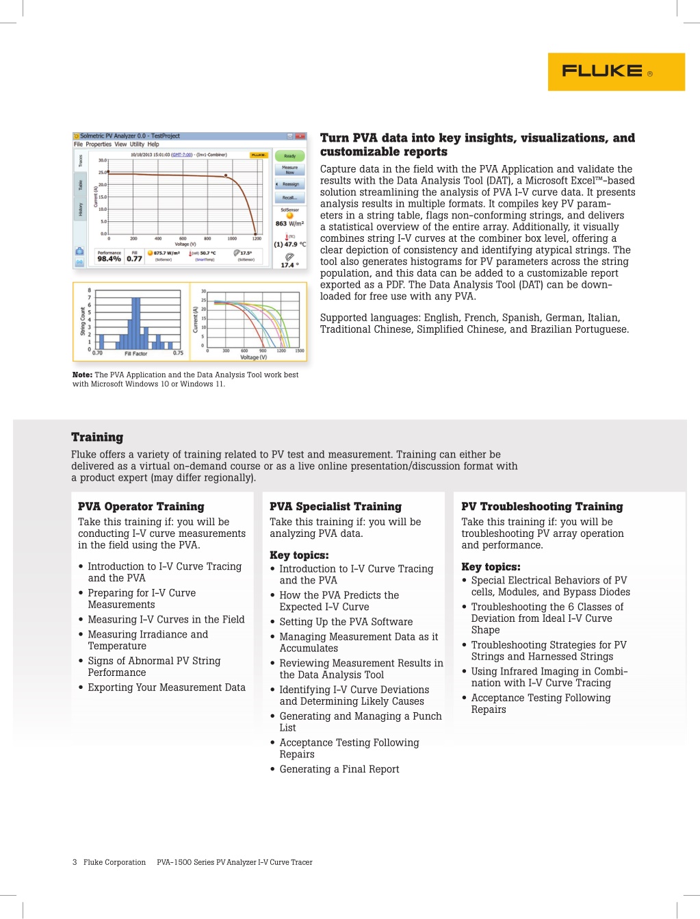 Turn PVA data into key insights, visualizations, and customizable reports Capture data in the field with the PVA Application and validate the results with the Data Analysis Tool (DAT), a Microsoft Excel™-based solution streamlining the analysis of PVA I-V curve data. It presents analysis results in multiple formats. It compiles key PV param- eters in a string table, flags non-conforming strings, and delivers a statistical overview of the entire array. Additionally, it visually combines string I-V curves at the combiner box level, offering a clear depiction of consistency and identifying atypical strings. The tool also generates histograms for PV parameters across the string population, and this data can be added to a customizable report exported as a PDF. The Data Analysis Tool (DAT) can be down- loaded for free use with any PVA. Supported languages: English, French, Spanish, German, Italian, Traditional Chinese, Simplified Chinese, and Brazilian Portuguese. Note: The PVA Application and the Data Analysis Tool work best with Microsoft Windows 10 or Windows 11. Training Fluke offers a variety of training related to PV test and measurement. Training can either be delivered as a virtual on-demand course or as a live online presentation/discussion format with a product expert (may differ regionally). PVA Operator Training Take this training if: you will be conducting I-V curve measurements in the field using the PVA. PVA Specialist Training Take this training if: you will be analyzing PVA data. PV Troubleshooting Training Take this training if: you will be troubleshooting PV array operation and performance. Key topics: • Introduction to I-V Curve Tracing and the PVA • How the PVA Predicts the Expected I-V Curve • Setting Up the PVA Software • Managing Measurement Data as it Accumulates • Reviewing Measurement Results in the Data Analysis Tool • Identifying I-V Curve Deviations and Determining Likely Causes • Generating and Managing a Punch List • Acceptance Testing Following Repairs • Generating a Final Report Key topics: • Special Electrical Behaviors of PV cells, Modules, and Bypass Diodes • Troubleshooting the 6 Classes of Deviation from Ideal I-V Curve Shape • Troubleshooting Strategies for PV Strings and Harnessed Strings • Using Infrared Imaging in Combi- nation with I-V Curve Tracing • Acceptance Testing Following Repairs • Introduction to I-V Curve Tracing and the PVA • Preparing for I-V Curve Measurements • Measuring I-V Curves in the Field • Measuring Irradiance and Temperature • Signs of Abnormal PV String Performance • Exporting Your Measurement Data 3 Fluke Corporation PVA-1500 Series PV Analyzer I-V Curve Tracer
