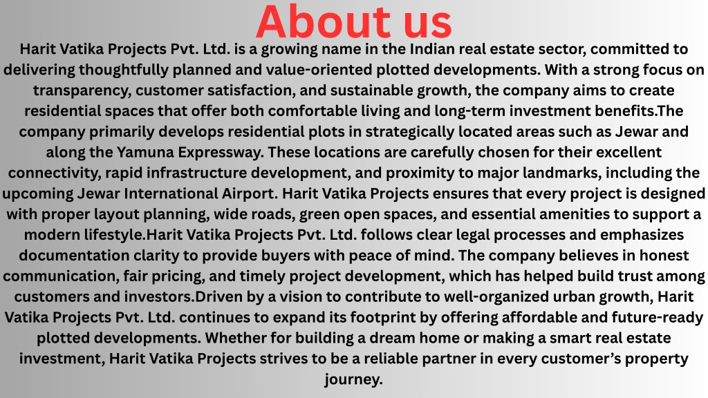 3. About us Harit Vatika Projects Pvt. Ltd. is a growing name in the Indian real estate sector, committed to delivering thoughtfully planned and value-oriented plotted developments. With a strong focus on transparency, customer satisfaction, and sustainable growth, the company aims to create residential spaces that offer both comfortable living and long-term investment benefits.The company primarily develops residential plots in strategically located areas such as Jewar and along the Yamuna Expressway. These locations are carefully chosen for their excellent connectivity, rapid infrastructure development, and proximity to major landmarks, including the upcoming Jewar International Airport. Harit Vatika Projects ensures that every project is designed with proper layout planning, wide roads, green open spaces, and essential amenities to support a modern lifestyle.Harit Vatika Projects Pvt. Ltd. follows clear legal processes and emphasizes documentation clarity to provide buyers with peace of mind. The company believes in honest communication, fair pricing, and timely project development, which has helped build trust among customers and investors.Driven by a vision to contribute to well-organized urban growth, Harit Vatika Projects Pvt. Ltd. continues to expand its footprint by offering affordable and future-ready plotted developments. Whether for building a dream home or making a smart real estate investment, Harit Vatika Projects strives to be a reliable partner in every customer’s property journey.