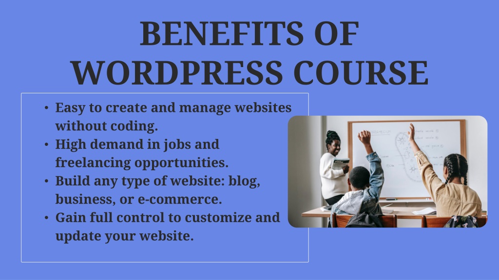 6. 01 02 03 04 05 Easy to use. Huge demand in IT industry. Best for freelancing. Useful for business owner. Great for digital marketing. WHAT YOU LEARN IN WORDPRESS COURSE
