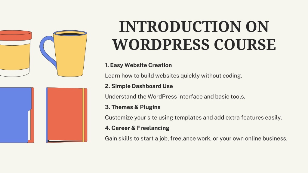 2. INTRODUCTION ON WORDPRESS COURSE 1. Easy Website Creation Learn how to build websites quickly without coding. 2. Simple Dashboard Use Understand the WordPress interface and basic tools. 3. Themes & Plugins Customize your site using templates and add extra features easily. 4. Career & Freelancing Gain skills to start a job, freelance work, or your own online business.
