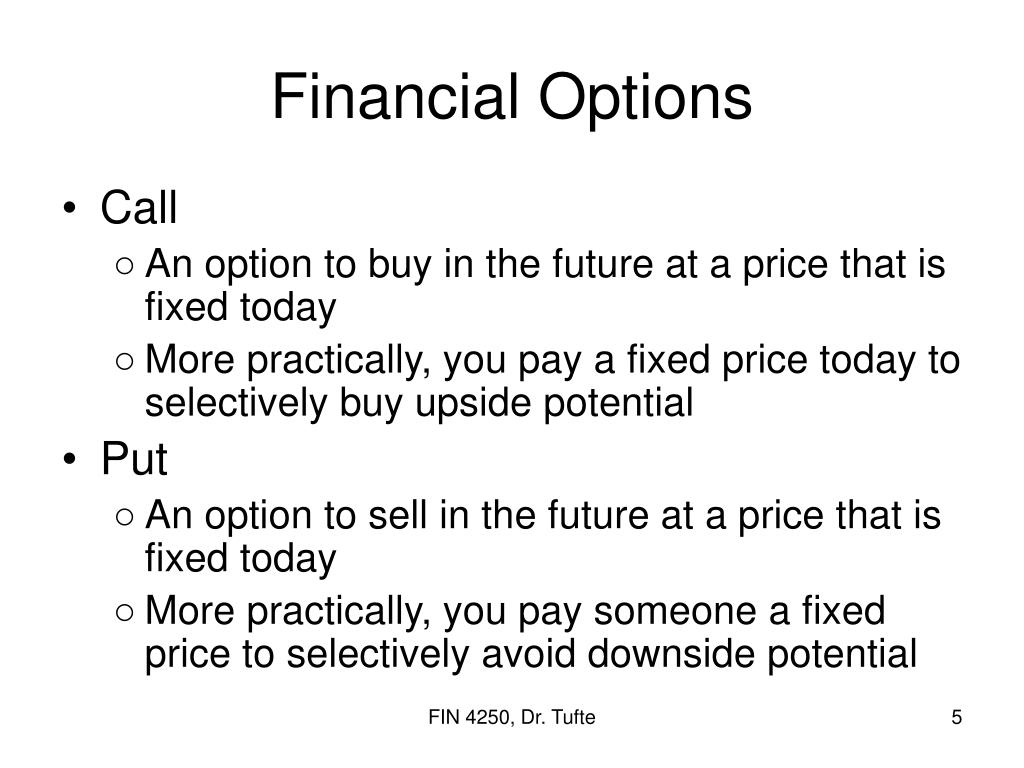 Financial Options • Call • An option to buy in the future at a price that is fixed today • More practically, you pay a fixed price today to selectively buy upside potential • Put • An option to sell in the future at a price that is fixed today • More practically, you pay someone a fixed price to selectively avoid downside potential FIN 4250, Dr. Tufte