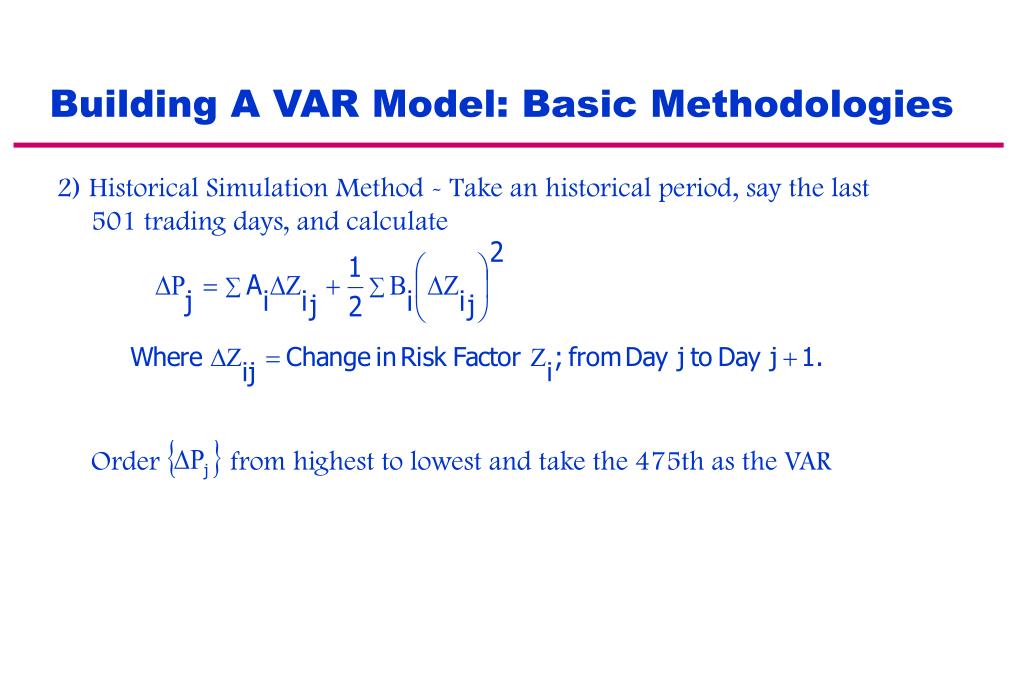 Building A VAR Model: Basic Methodologies 2) Historical Simulation Method - Take an historical period, say the last 501 trading days, and calculate Order from highest to lowest and take the 475th as the VAR