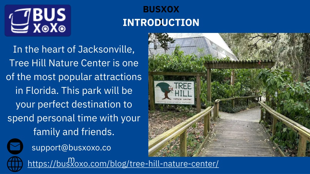 2. BUSXOXO INTRODUCTION In the heart of Jacksonville, Tree Hill Nature Center is one of the most popular attractions in Florida. This park will be your perfect destination to spend personal time with your family and friends. support@busxoxo.com https://busxoxo.com/blog/tree-hill-nature-center/