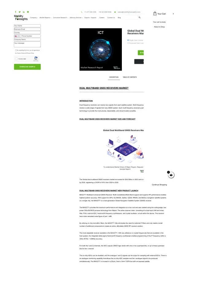 +1 217 636 3356 +44 20 3289 9440 sales@mobilityforesights.com Your Cart 0 Company Market Reports Consumer Research Advisory Services Exports - Imports Careers Contact Us Blog Your cart is empty Your Name Return to Shop Business Email Global Dual Multiband GNSS Receivers Market 2024-2030 Country Phone Number +1 Company Name Single User License : $ 3,950 Your message Corporate User License : $ 6,000 By submitting this form, you are agreeing to Request Sample the Terms of Use and Privacy Policy. I'm not a robot reCAPTCHA Privacy - Terms BUY NOW DOWNLOAD SAMPLE DESCRIPTION TABLE OF CONTENTS DUAL MULTIBAND GNSS RECEIVERS MARKET INTRODUCTION Dual-frequency receivers can receive two signals from each satellite system. Multi-frequency receivers, on the other hand, receive a wide range of signals from any GNSS system. Such multi-frequency receivers push the boundaries of GNSS technology to provide the most precise, dependable, and robust location possible. DUAL MULTIBAND GNSS RECEIVERS MARKET SIZE AND FORECAST 0 The Global dual multiband GNSS receivers market accounted for $XX Billion in 2023 and is anticipated to reach $XX Billion by 2030, registering a CAGR of XX% from 2024 to 2030. Continue Shopping DUAL MULTIBAND GNSS RECEIVERS MARKET NEW PRODUCT LAUNCH MAX2771 Multiband Universal GNSS Receiver. Multi-Constellation/Multi-Band support and superior RF performance enables highest position accuracy. With support for GPS, GLONASS, Galileo, QZSS, IRNSS, and BeiDou navigation satellite systems on a single chip, the MAX2771 is a next-generation Global Navigation Satellite System (GNSS) receiver. The MAX2771 provides the maximum performance and integration at a low cost and was created using the cutting-edge, low- power SiGe BiCMOS process technology from Maxim. The entire receiver chain, consisting of a dual-input LNA and mixer, filter, PGA, multi-bit ADC, fractional-N frequency synthesisers, and crystal oscillator, is built within the device. This receiver has a total cascaded noise figure of just 1.4dB. By utilising on-chip monolithic filters, the MAX2771 fully eliminates the need for external IF filters and only needs a small number of additional components to create an entire, affordable GNSS RF receiver solution. The most adaptable receiver available is the MAX2771. With any reference or crystal frequencies that are available in the host system, the integrated delta-sigma fractional-N frequency synthesiser enables programming of the IF frequency within a 30Hz (fXTAL = 32MHz) accuracy. For both the I and Q channels, the ADC outputs CMOS logic levels with one or two quantized bits, or up to three quantized bits for the I channel. The on-chip ADCs can be disabled, and the analogue I and Q signals can be output for sampling with external ADCs. There is an analogue monitoring capability that allows the on-chip ADC samples and the I analogue signal to be produced simultaneously. The MAX2771 is housed in a 28-pin, 5mm x 5mm TQFN box with an exposed paddle.