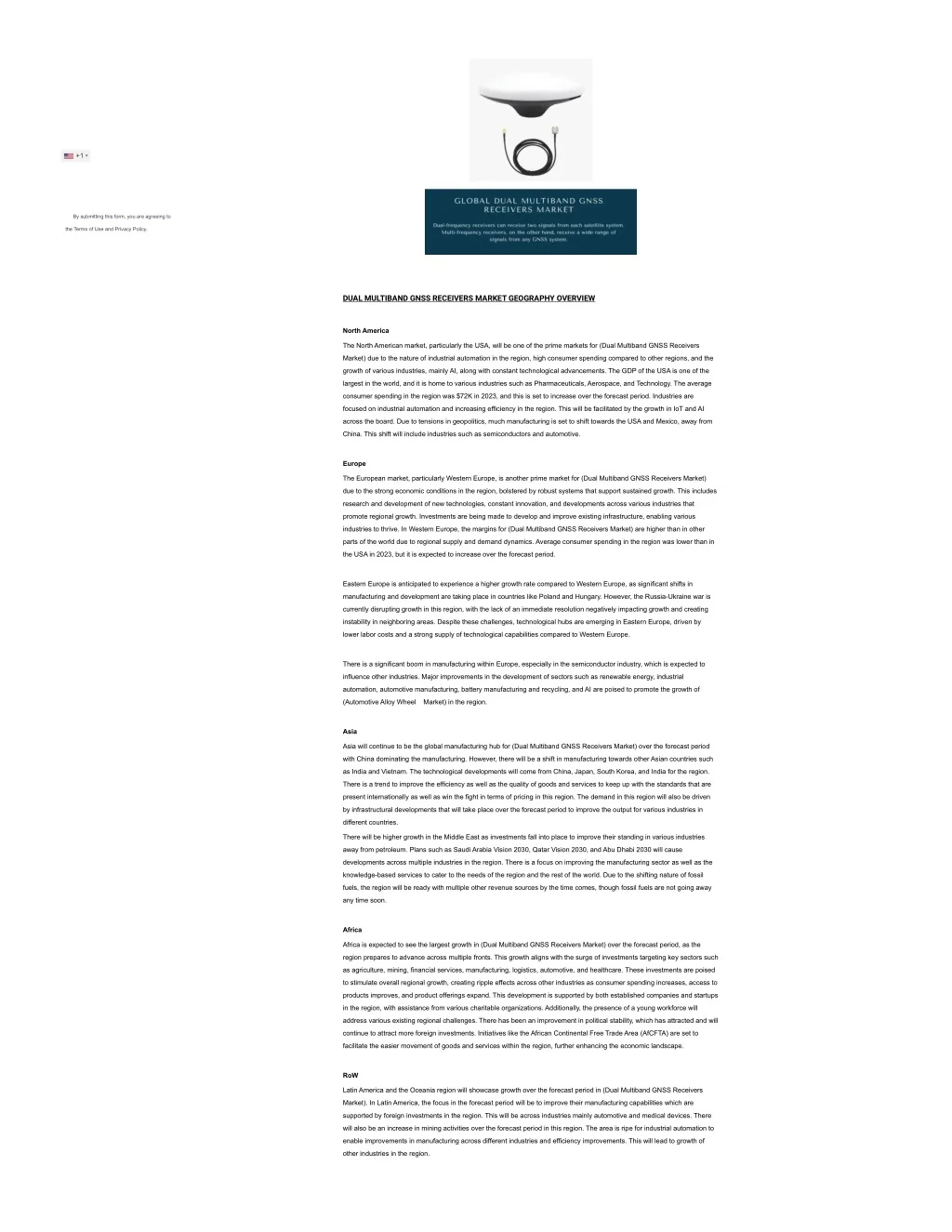 +1 By submitting this form, you are agreeing to the Terms of Use and Privacy Policy. DUAL MULTIBAND GNSS RECEIVERS MARKET GEOGRAPHY OVERVIEW North America The North American market, particularly the USA, will be one of the prime markets for (Dual Multiband GNSS Receivers Market) due to the nature of industrial automation in the region, high consumer spending compared to other regions, and the growth of various industries, mainly AI, along with constant technological advancements. The GDP of the USA is one of the largest in the world, and it is home to various industries such as Pharmaceuticals, Aerospace, and Technology. The average consumer spending in the region was $72K in 2023, and this is set to increase over the forecast period. Industries are focused on industrial automation and increasing efficiency in the region. This will be facilitated by the growth in IoT and AI across the board. Due to tensions in geopolitics, much manufacturing is set to shift towards the USA and Mexico, away from China. This shift will include industries such as semiconductors and automotive. Europe The European market, particularly Western Europe, is another prime market for (Dual Multiband GNSS Receivers Market) due to the strong economic conditions in the region, bolstered by robust systems that support sustained growth. This includes research and development of new technologies, constant innovation, and developments across various industries that promote regional growth. Investments are being made to develop and improve existing infrastructure, enabling various industries to thrive. In Western Europe, the margins for (Dual Multiband GNSS Receivers Market) are higher than in other parts of the world due to regional supply and demand dynamics. Average consumer spending in the region was lower than in the USA in 2023, but it is expected to increase over the forecast period. Eastern Europe is anticipated to experience a higher growth rate compared to Western Europe, as significant shifts in manufacturing and development are taking place in countries like Poland and Hungary. However, the Russia-Ukraine war is currently disrupting growth in this region, with the lack of an immediate resolution negatively impacting growth and creating instability in neighboring areas. Despite these challenges, technological hubs are emerging in Eastern Europe, driven by lower labor costs and a strong supply of technological capabilities compared to Western Europe. There is a significant boom in manufacturing within Europe, especially in the semiconductor industry, which is expected to influence other industries. Major improvements in the development of sectors such as renewable energy, industrial automation, automotive manufacturing, battery manufacturing and recycling, and AI are poised to promote the growth of (Automotive Alloy Wheel Market) in the region. Asia Asia will continue to be the global manufacturing hub for (Dual Multiband GNSS Receivers Market) over the forecast period with China dominating the manufacturing. However, there will be a shift in manufacturing towards other Asian countries such as India and Vietnam. The technological developments will come from China, Japan, South Korea, and India for the region. There is a trend to improve the efficiency as well as the quality of goods and services to keep up with the standards that are present internationally as well as win the fight in terms of pricing in this region. The demand in this region will also be driven by infrastructural developments that will take place over the forecast period to improve the output for various industries in different countries. There will be higher growth in the Middle East as investments fall into place to improve their standing in various industries away from petroleum. Plans such as Saudi Arabia Vision 2030, Qatar Vision 2030, and Abu Dhabi 2030 will cause developments across multiple industries in the region. There is a focus on improving the manufacturing sector as well as the knowledge-based services to cater to the needs of the region and the rest of the world. Due to the shifting nature of fossil fuels, the region will be ready with multiple other revenue sources by the time comes, though fossil fuels are not going away any time soon. Africa Africa is expected to see the largest growth in (Dual Multiband GNSS Receivers Market) over the forecast period, as the region prepares to advance across multiple fronts. This growth aligns with the surge of investments targeting key sectors such as agriculture, mining, financial services, manufacturing, logistics, automotive, and healthcare. These investments are poised to stimulate overall regional growth, creating ripple effects across other industries as consumer spending increases, access to products improves, and product offerings expand. This development is supported by both established companies and startups in the region, with assistance from various charitable organizations. Additionally, the presence of a young workforce will address various existing regional challenges. There has been an improvement in political stability, which has attracted and will continue to attract more foreign investments. Initiatives like the African Continental Free Trade Area (AfCFTA) are set to facilitate the easier movement of goods and services within the region, further enhancing the economic landscape. RoW Latin America and the Oceania region will showcase growth over the forecast period in (Dual Multiband GNSS Receivers Market). In Latin America, the focus in the forecast period will be to improve their manufacturing capabilities which are supported by foreign investments in the region. This will be across industries mainly automotive and medical devices. There will also be an increase in mining activities over the forecast period in this region. The area is ripe for industrial automation to enable improvements in manufacturing across different industries and efficiency improvements. This will 