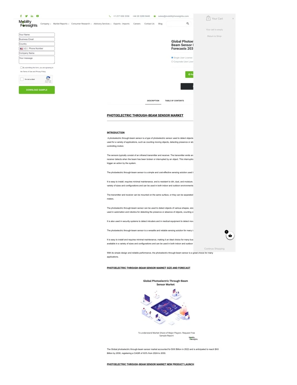 +1 217 636 3356 +44 20 3289 9440 sales@mobilityforesights.com Your Cart 0 Company Market Reports Consumer Research Advisory Services Exports - Imports Careers Contact Us Blog Your cart is empty Your Name Return to Shop Business Email Global Photoelectric Through- Beam Sensor Market Size, Forecasts 2030 Country Phone Number +1 Company Name Single User License : $ 4,000 Your message Corporate User License : $ 6,000 By submitting this form, you are agreeing to the Terms of Use and Privacy Policy. Request Sample I'm not a robot reCAPTCHA Privacy - Terms BUY NOW DOWNLOAD SAMPLE DESCRIPTION TABLE OF CONTENTS PHOTOELECTRIC THROUGH-BEAM SENSOR MARKET INTRODUCTION A photoelectric through-beam sensor is a type of photoelectric sensor used to detect objects in motion. This type of sensor is used for a variety of applications, such as counting moving objects, detecting presence or absence in a given area, or controlling motion. The sensors typically consist of an infrared transmitter and receiver. The transmitter emits an infrared beam of light and the receiver detects when the beam has been broken or interrupted by an object. This interruption of the beam is then used to trigger an action by the system. The photoelectric through-beam sensor is a simple and cost-effective sensing solution used in many industrial applications. It is easy to install, requires minimal maintenance, and is resistant to dirt, dust, and moisture. The sensors are available in a variety of sizes and configurations and can be used in both indoor and outdoor environments. The transmitter and receiver can be mounted on the same surface, or they can be separated by a distance up to several meters. The photoelectric through-beam sensor can be used to detect objects of various shapes, sizes, and distances. It is commonly used in automation and robotics for detecting the presence or absence of objects, counting objects, and controlling motion. It is also used in security systems to detect intruders and in medical equipment to detect movement of patients. The photoelectric through-beam sensor is a versatile and reliable sensing solution for many industrial applications. 0 It is easy to install and requires minimal maintenance, making it an ideal choice for many businesses. The sensors are available in a variety of sizes and configurations and can be used in both indoor and outdoor environments. Continue Shopping With its simple design and reliable performance, the photoelectric through-beam sensor is a great choice for many applications. PHOTOELECTRIC THROUGH-BEAM SENSOR MARKET SIZE AND FORECAST The Global photoelectric through-beam sensor market accounted for $XX Billion in 2022 and is anticipated to reach $XX Billion by 2030, registering a CAGR of XX% from 2024 to 2030. PHOTOELECTRIC THROUGH-BEAM SENSOR MARKET NEW PRODUCT LAUNCH