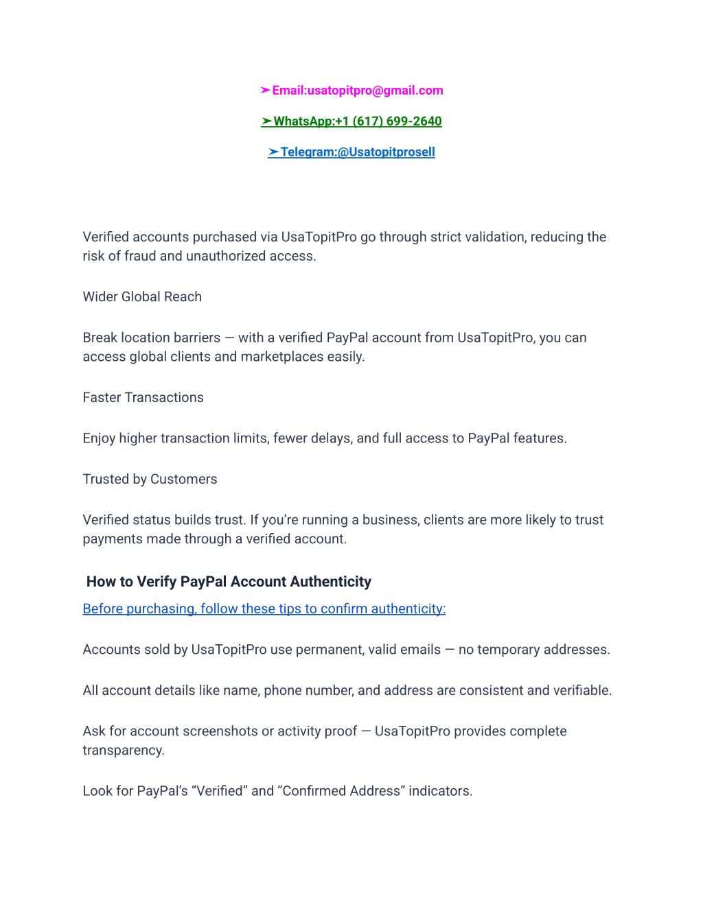 ➤Email:usatopitpro@gmail.com ➤WhatsApp:+1 (617) 699-2640 ➤Telegram:@Usatopitprosell Verified accounts purchased via UsaTopitPro go through strict validation, reducing the risk of fraud and unauthorized access. Wider Global Reach Break location barriers — with a verified PayPal account from UsaTopitPro, you can access global clients and marketplaces easily. Faster Transactions Enjoy higher transaction limits, fewer delays, and full access to PayPal features. Trusted by Customers Verified status builds trust. If you’re running a business, clients are more likely to trust payments made through a verified account. How to Verify PayPal Account Authenticity Before purchasing, follow these tips to confirm authenticity: Accounts sold by UsaTopitPro use permanent, valid emails — no temporary addresses. All account details like name, phone number, and address are consistent and verifiable. Ask for account screenshots or activity proof — UsaTopitPro provides complete transparency. Look for PayPal’s “Verified” and “Confirmed Address” indicators.